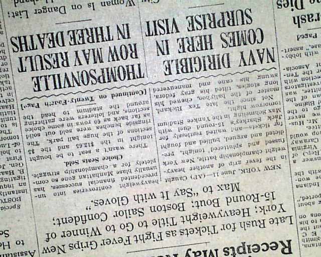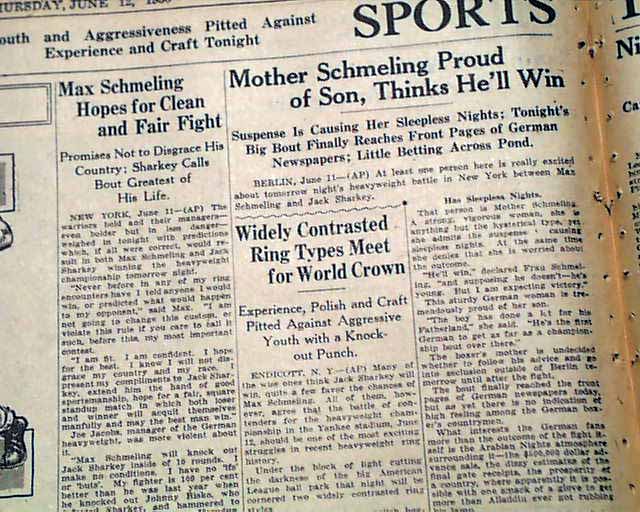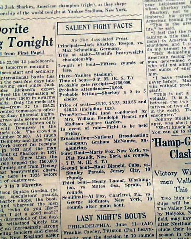 This 32 page newspaper has two column headlines on the front page: "Sharkey Is 9 to 5 Favorite to Defeat Schmeling Tonight; Receipts May Reach $750,000".