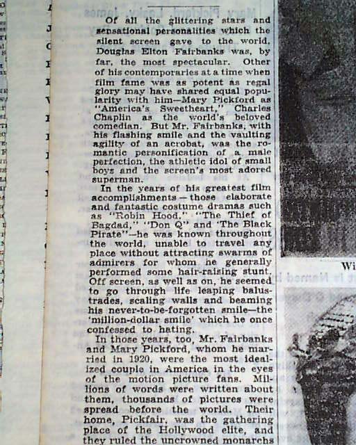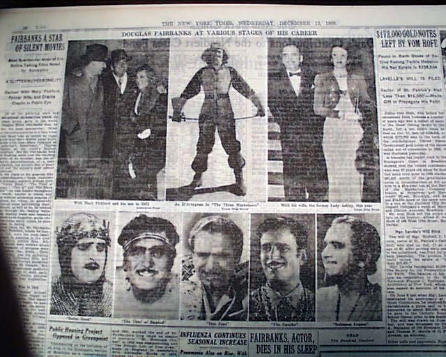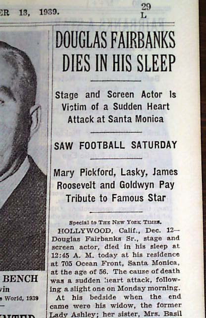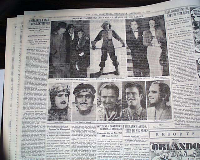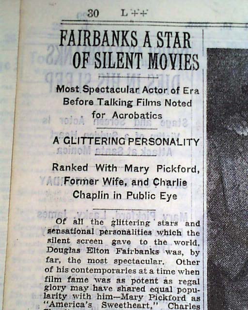 NEW YORK TIMES, Dec. 13, 1939 Pg. 29 two line, 1 col. head: "Douglas Fairbanks Dies In His Sleep" & subheads, and on pg. 30: "Fairbanks A Star Of Silent Movies" & subheads: "Most Spectacular of Era Before Talking Films Noted for Acrobatics" "Ranked With Mary Pickford, Former Wife, and Charlie Chaplin in Public Eye". Includes eight photos, mostly from his career.