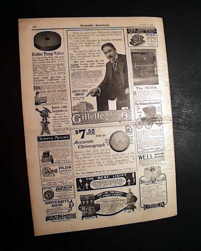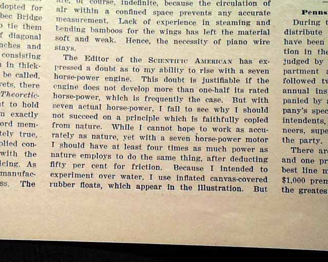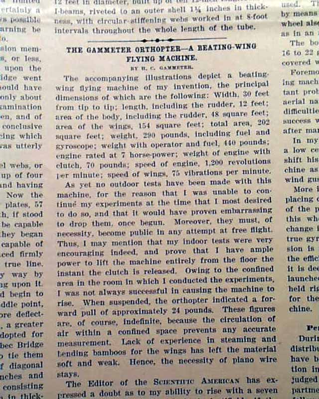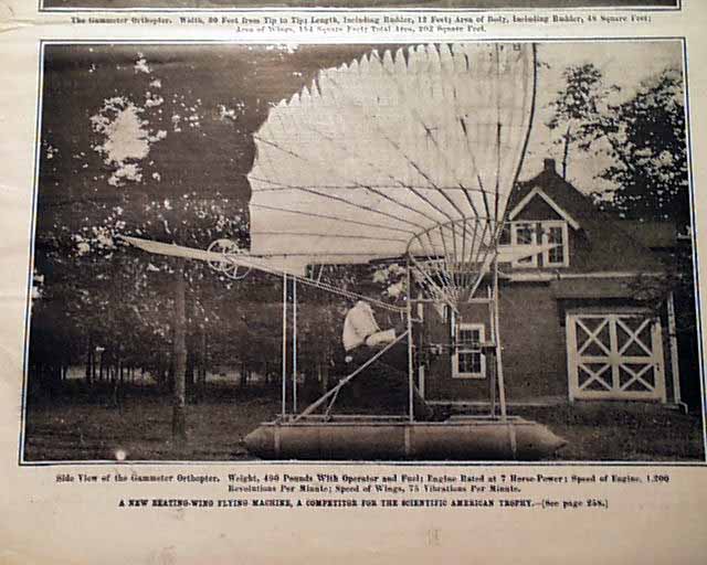 SCIENTIFIC AMERICAN, New York, October 12, 1907 The frontpage features two almost comical photos of an early attempt at an airplane, called: "The Gammeter Orthopter". Another caption notes: "A New Beating-Wing Flying Machine, a Competitor for the Scientific American Trophy." Interesting that this bizarre concept was a consideration four years after the Wright brothers' flight.