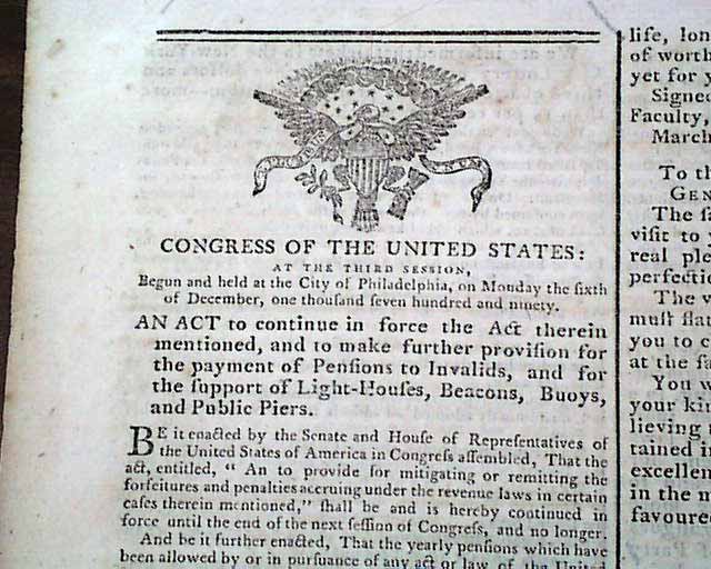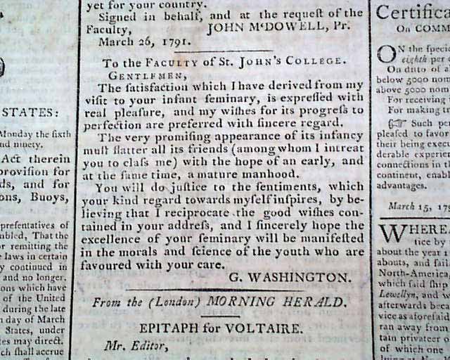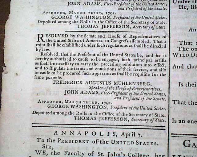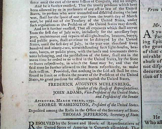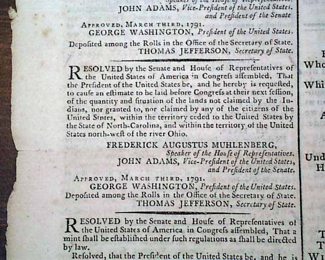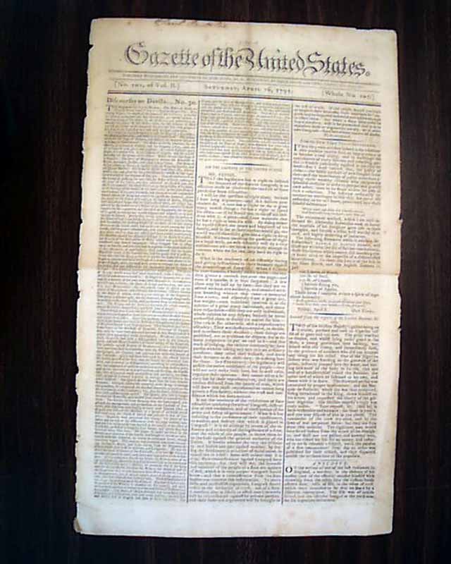 GAZETTE OF THE UNITED STATES, Philadelphia, April 16, 1791 The back
