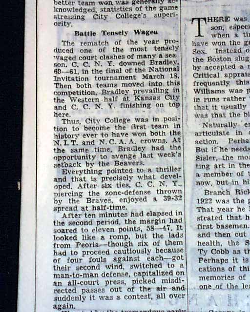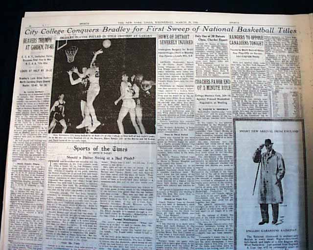 This 60 page has a banner headline on page 40: "City College Conquers Bradley for First Sweep of National Basketball Titles" with subheads that include: "BEAVERS TRIUMPH AT GARDEN" "C.C.N.Y., Invitation Victor, Becomes First Five to Win N.C.A.A. Title Also". Related photo as well. Other news of the day throughout. Rag edition in great condition.