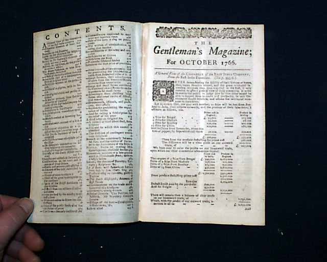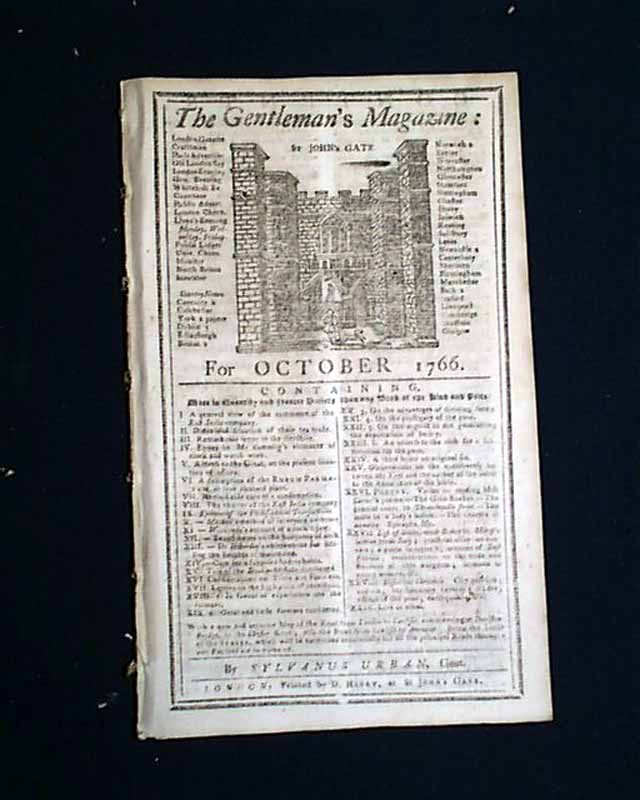 Here is a complete, genuine issue of THE GENTLEMAN'S MAGAZINE from London England. This magazine is dated: October, 1766 and is about 55 pages in length.