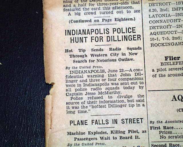 This 28 page newspaper has one column headlines on the front page:  "INDIANAPOLIS POLICE HUNT FOR DILLINGER", "Hot Tip Sends Radio Squads Through Western City in New Search for Notorious Outlaw", and more.  Though not mentioned in the article, John Dillinger became the very first public enemy No. 1 the day before which some newspapers reported on this date but not this one officially.  Other news of the day throughout.