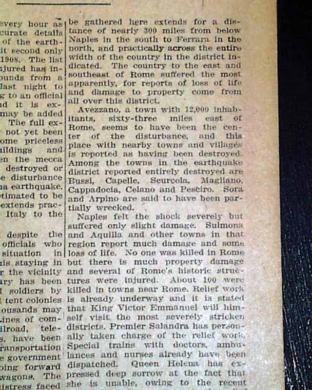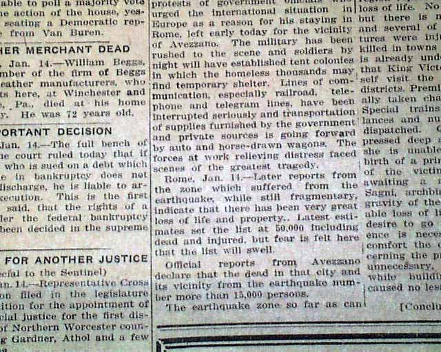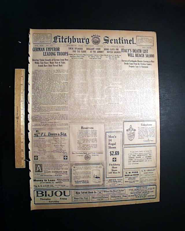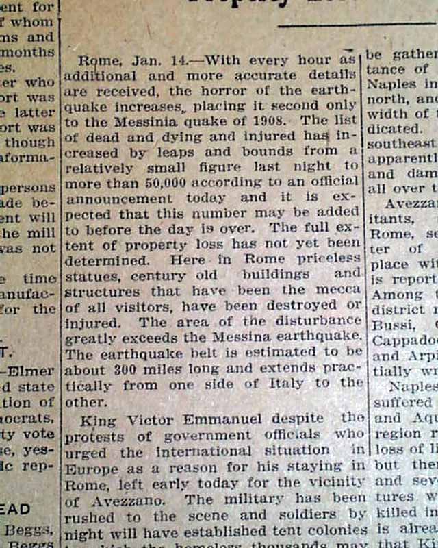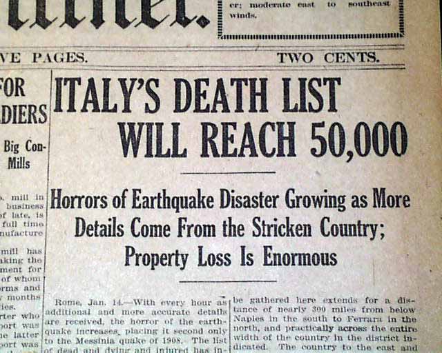 This 12 page newspaper has two column headlines on the front page: "ITALY'S DEATH LIST WILL REACH 50,000" "Horrors of Earthquake Disaster Growing as More Details Come from the Stricken Country; Property Loss Is Enormous"