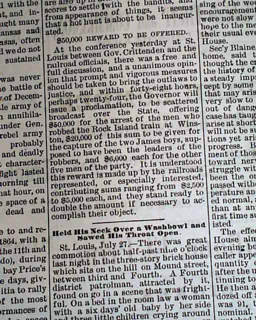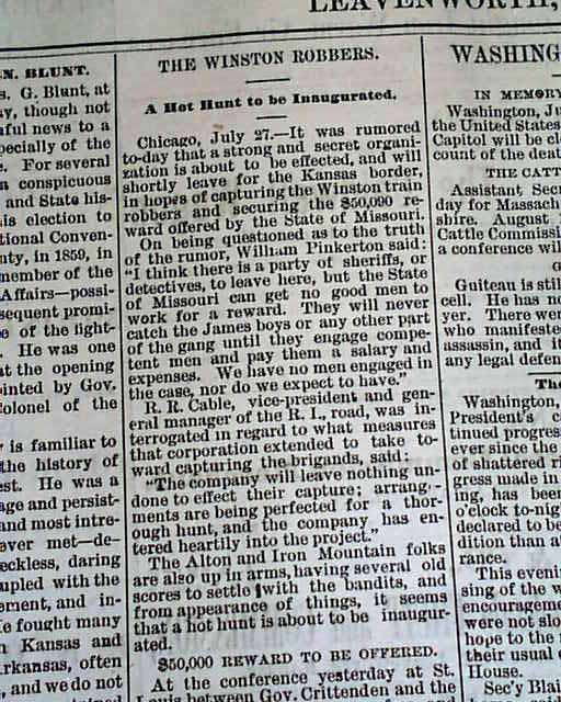 The top of the front page has a column headed: "The Winston Robbers" "A Hot Hunt to be Inaugurated". This train robbery was, in fact, committed by Jesse & Frank James among others, although not known at the time this issue was published. This article takes about one-third of a column (see).