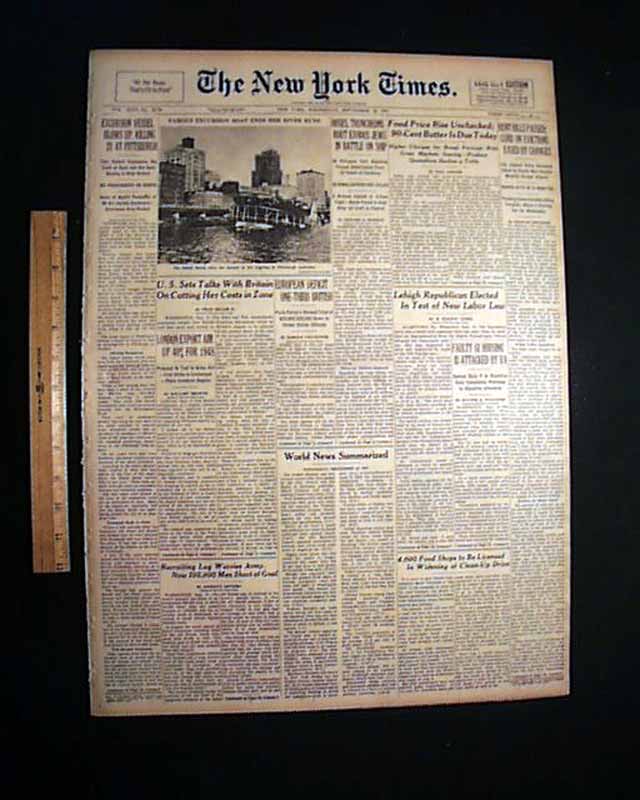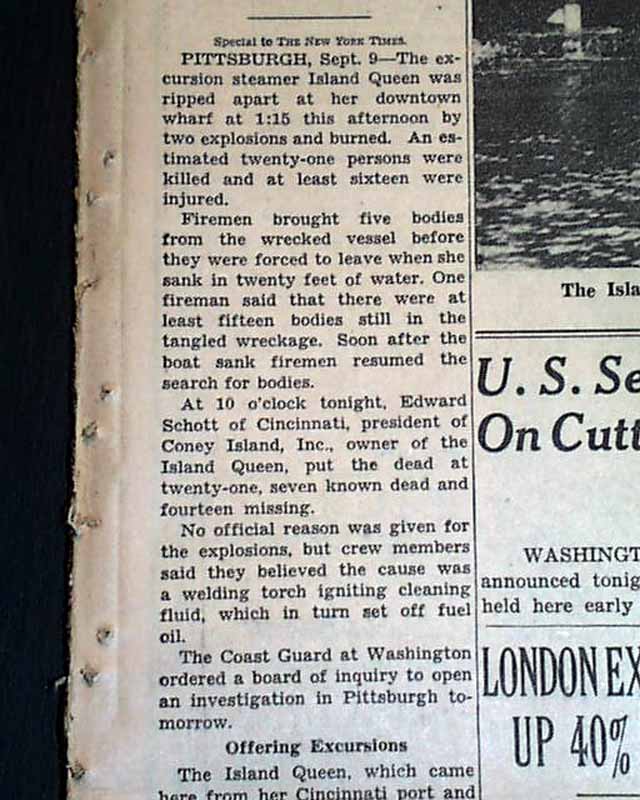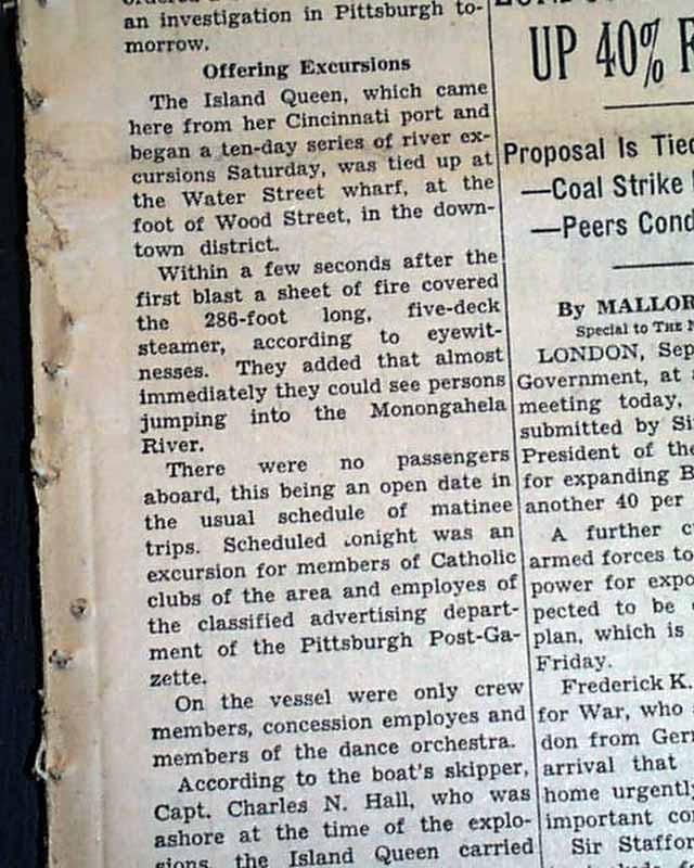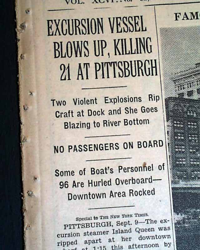 This 56 page newspaper has one column headlines on the front page that include: "EXCURSION VESSEL BLOWS UP, KILLING 21 AT PITTSBURGH" "Two Violent Explosions Rip Craft at Dock and She Goes Blazing to River Bottom" and more with related photo. (see)