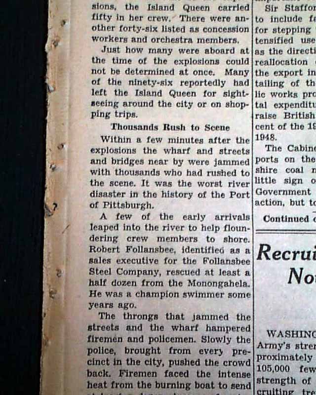 Tells of the excursion steamer "Island Queen" explosion on the Monongahela River at Pittsburgh, Pennsylvania.