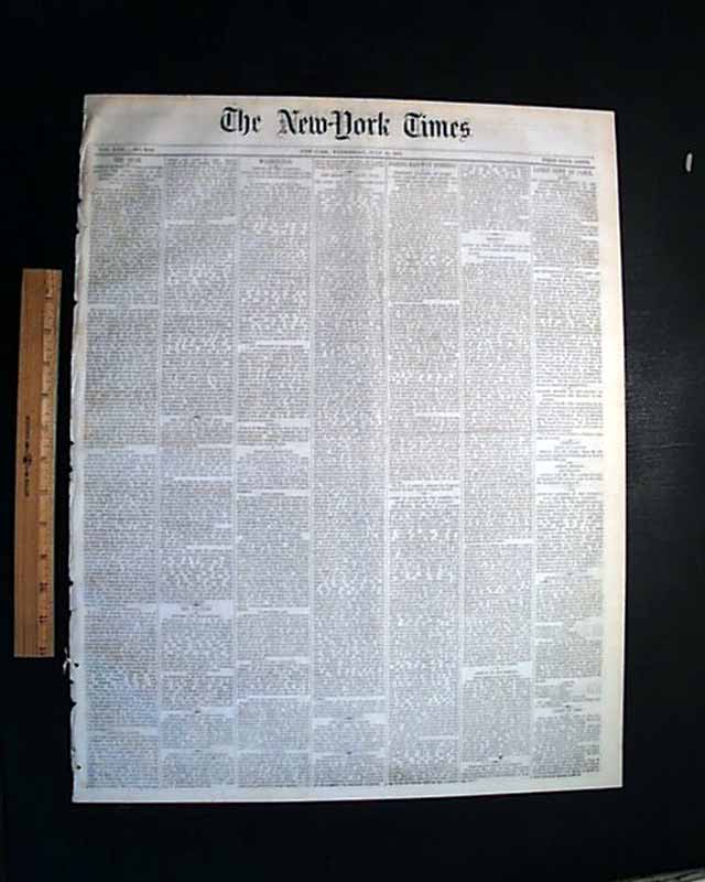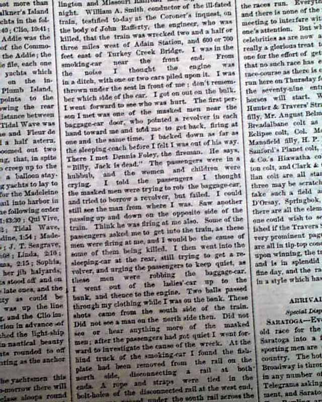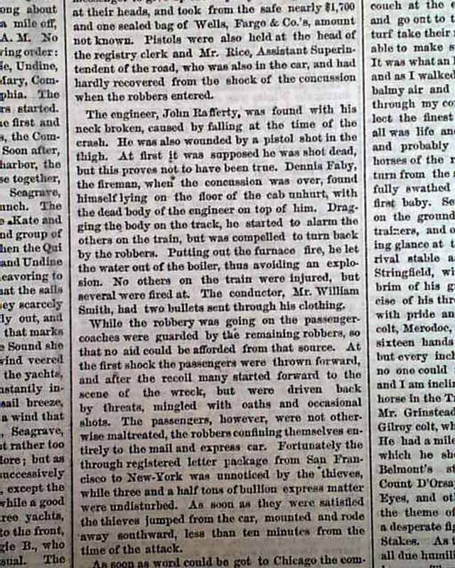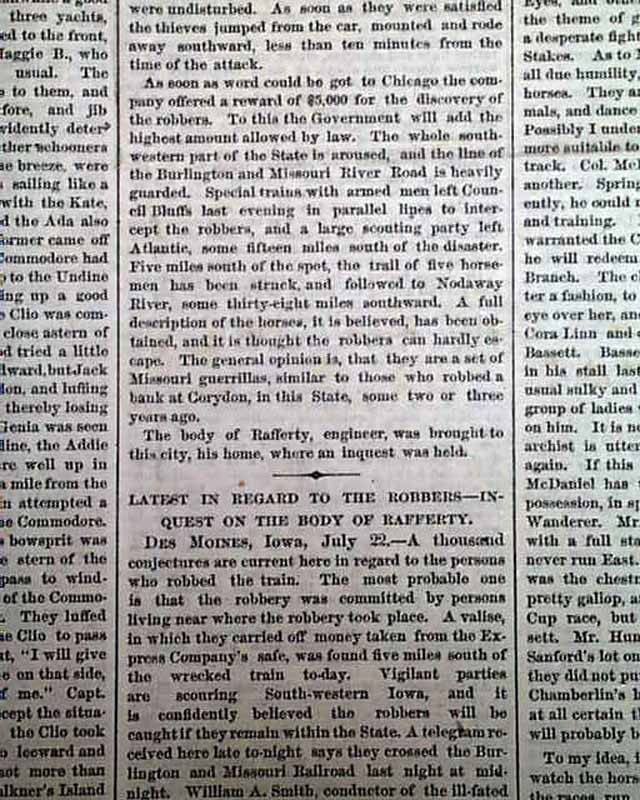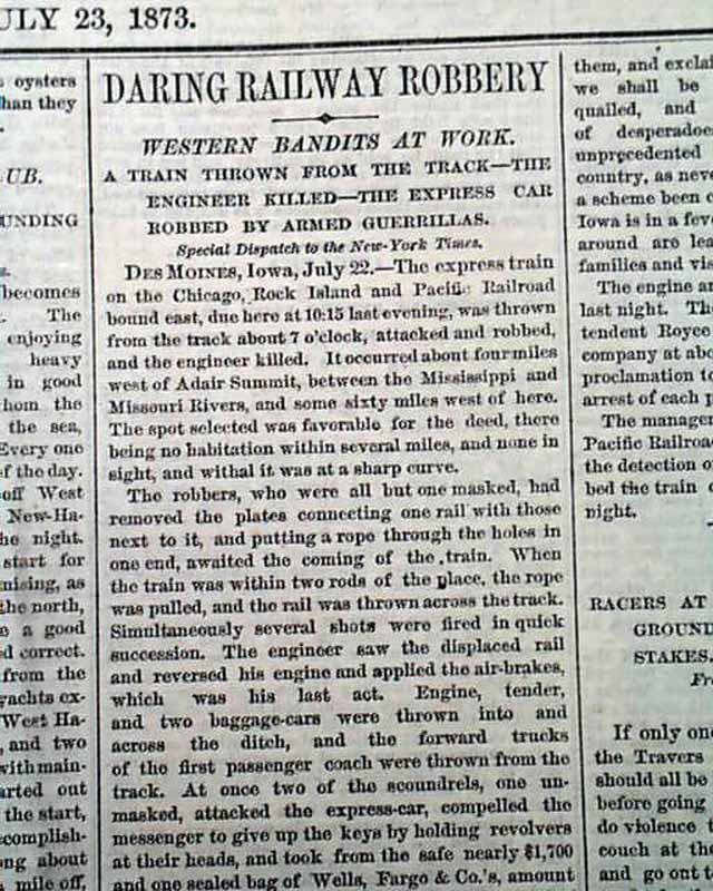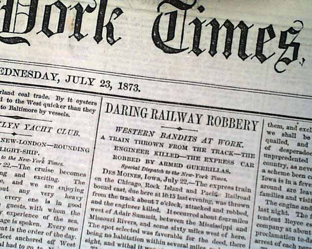 THE NEW YORK TIMES, July 23, 1873 The front page has more than a full column taken up with the first train robbery by Jesse James and the James Gang, although the men were not identified at the time of this report. The top of the ftpg. has: "DARING RAILWAY ROBBERY " "Western Bandits At Work" "A Train thrown From the Track--The Engineer Killed--The Express Car Robbed by Armed Guerrillas" with the text beginning: "The express train on the Chicago, Rock Island & Pacific Railroad bound east...was thrown from the track...attacked & robbed & the engineer killed...". Further on is: "The robbers, who were all but one masked, had removed the plates connecting one rail...At once two of the scoundrels, one unmasked, attacked the express car...took from the safe nearly $1700 and one sealed bag of Wells Fargo & Co.'s amount not known. Pistols were also held at the head of the registry clerk..." with other details (see). The subhead reads: "Latest In Regard to the Robbers--Inquest on the Body of Rafferty".