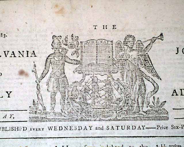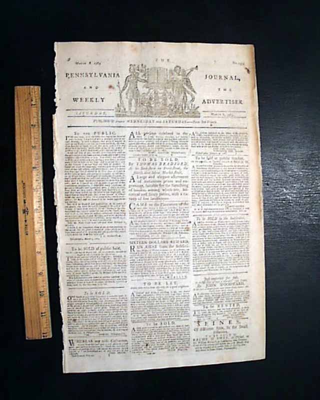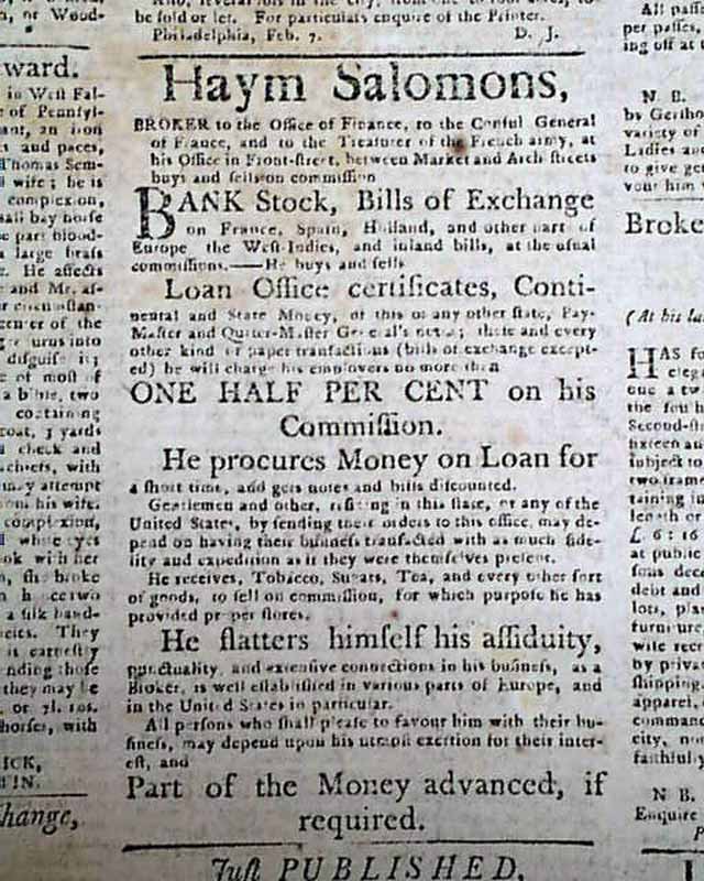 THE PENNSYLVANIA JOURNAL & WEEKLY ADVERTISER, Philadelphia, March 8, 1783 It is possible two advertisements have more significance than the content in this issue. The back page has a rather large ad for "Haym Salomons", the noted Jewish financier. Salomon was a Jewish emigrant from Poland, imprisoned in 1778 by the British for aiding the Revolutionaries and was condemned to death, but he escaped to Philadelphia. There he started a successful brokerage business. He aided Robert Morris in obtaining loans from France and pledged his own fortune to the new government to maintain its credit. Salomon was never recompensed and he died impoverished.