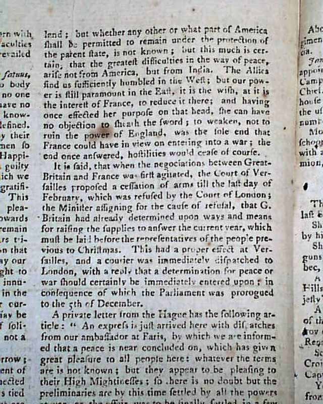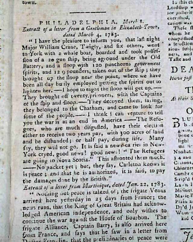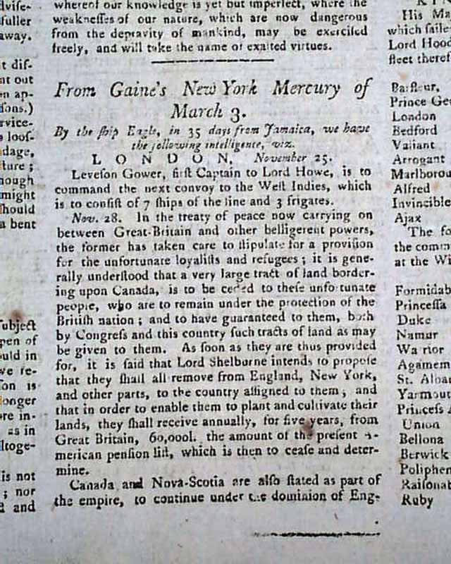 Page 2 has a report noting in part: "In the treaty of peace now carrying on between Great Britain & other belligerent powers, the former has taken care to stipulate for a provision for the unfortunate loyalists and refugees; it is generally understood that a very large tract of land bordering upon Canada is to be ceded to these unfortunate people..." with more. A few other end-of-war items in the issue as well.