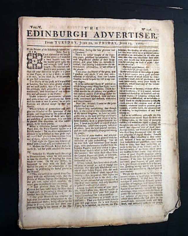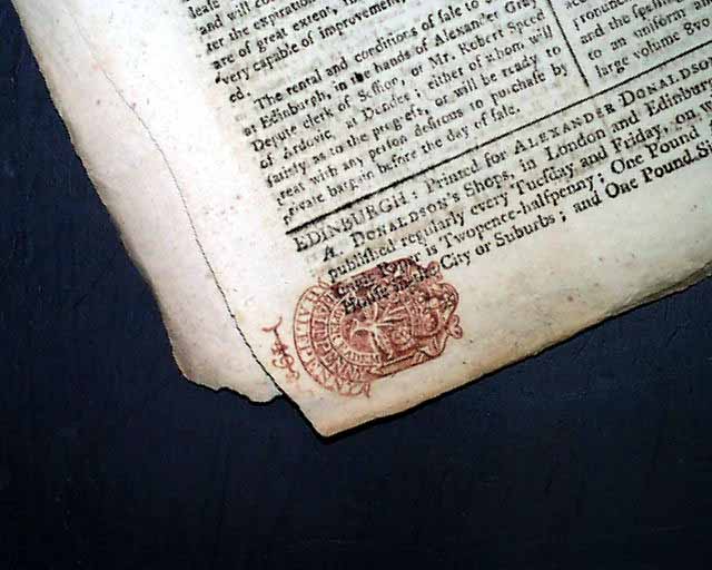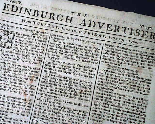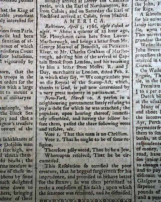 THE EDINBURGH ADVERTISER, Scotland, June 13, 1766 Inside has a report from Baltimore headed: "America" which notes: "...a quarter of an hour ago...brings a letter...advising him...'We congratulate you on the Repeal of the Stamp-Act, which, thanks to God, is just ow determined by a very great majority in parliament.' " followed by an unrelated report from New York.