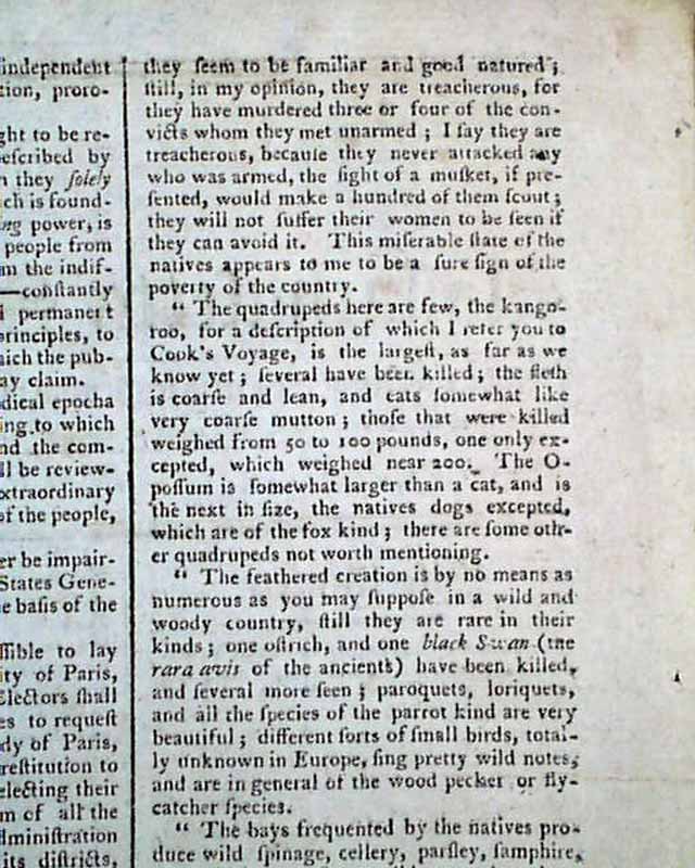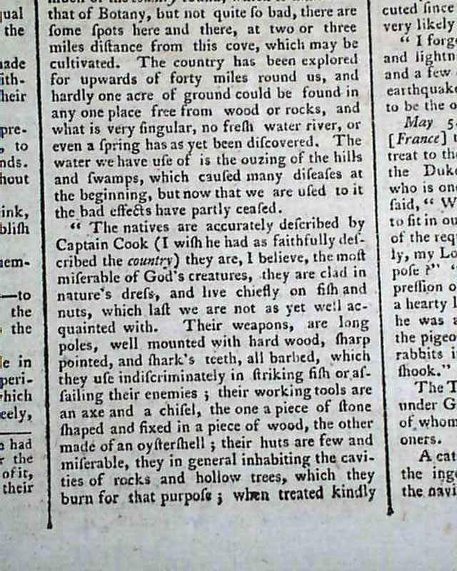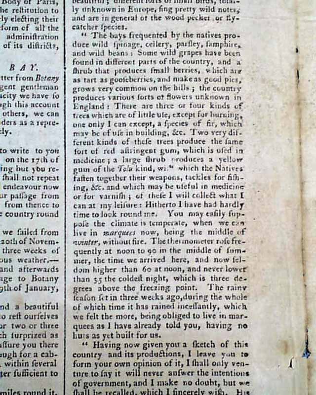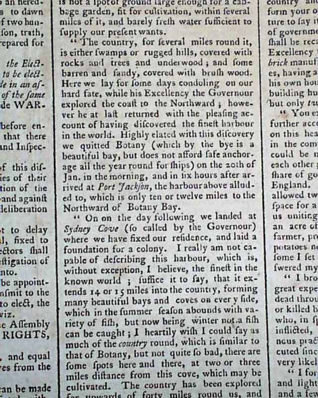 The article is titled: "Of Botany Bay" and begins by talking of their visit to the Cape of Good Hope in November, 1787 and continues with their: "...favourable passage to Botany Bay, where we arrived on the 19th of January, 1788. Here we expected to find a beautiful country...as well as to rest ourselves from our fatigues..." with much, much more (see for portions). A very significant report which takes the equivalent of half a page.