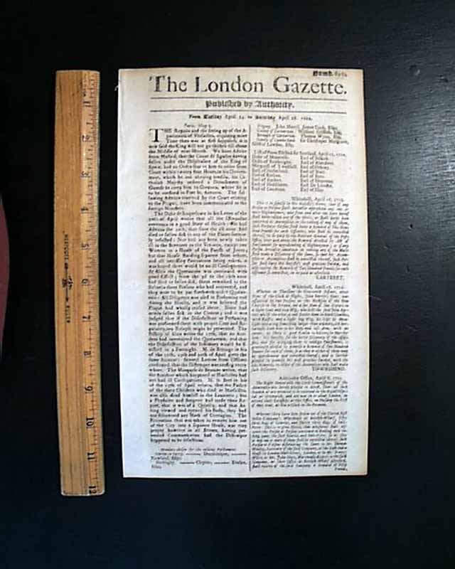Historical Background: "When in the autumn of 1665 Charles II sought shelter in Oxford from the Great Plague, he and his courtiers wanted newspapers to read, yet feared to touch "The Intelligencer" or "The News," which, coming from London, might be infected. Therefore Leonard Litchfeld, the university printer, was authorized and ordered to bring out a local paper. On Tuesday, November 14, 1665, the first number of "The Oxford Gazette" appeared, and it continued afterwards through eleven weeks on Thursdays and Mondays. It was meagre enough, but, though comprised in only two double-columned pages of folio, each number contained nearly as much matter as one of Roger L'Estrange's papers, and it soon became a formidable rival to those papers, especially as Thomas Newcombe, the old printer of the Commonwealth organs, was allowed to reproduce its sheets in London "for the use of some members and gentlemen who desired them.