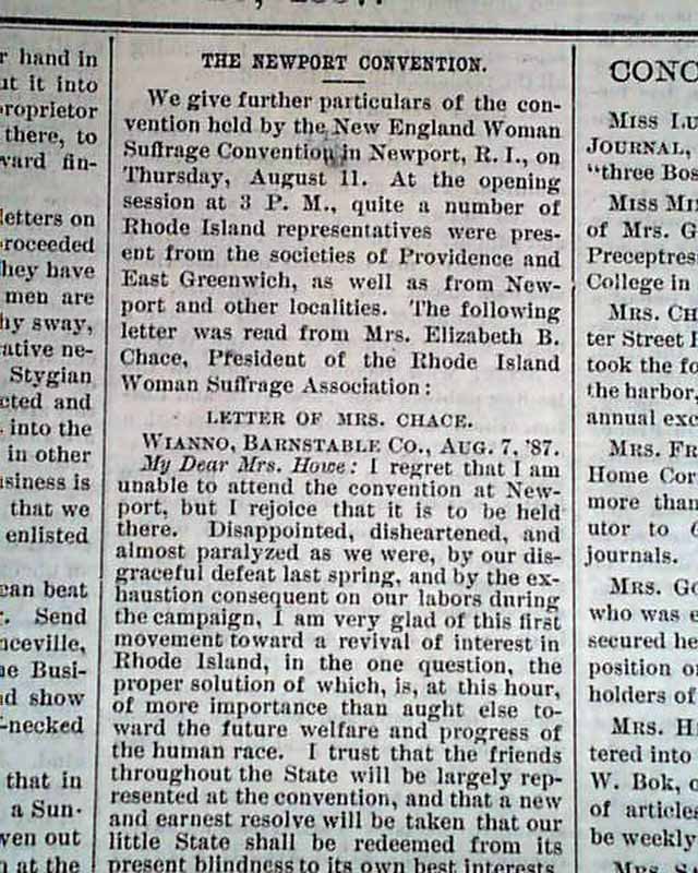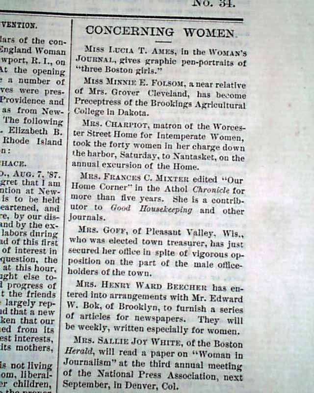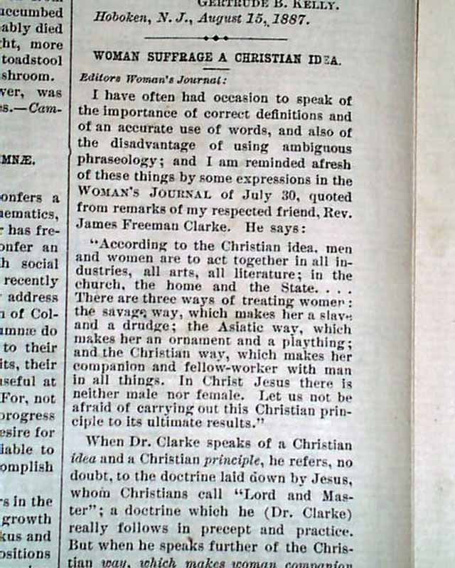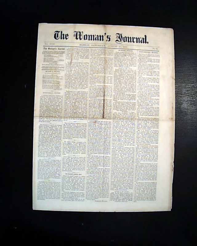 THE WOMAN'S JOURNAL, Boston, Aug. 20, 1887  Rare women's suffrage paper founded in 1870, edited by Mary Livermore, Lucy Stone and Julia Ward Howe among others (see). Published: "...to the interests of Woman, to her educational, industrial, legal & political Equality, "...to the interests of Woman--to her educational, industrial, legal & political Equality, & especially to her right of Suffrage". as noted at the top of page one.