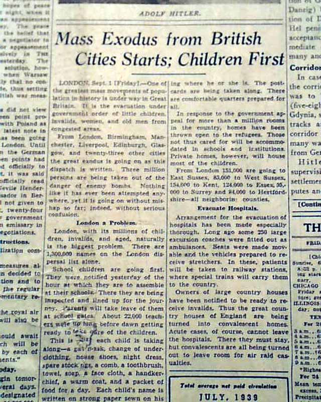 The banner headline announces the beginning of World War II: "WAR ! HITLER STRIKES ! " with subheads: "Fuehrer Acts After Warsaw Spurns Terms" and "Britain Mobilizes Forces; Poland Rushes to Arms" and more. Also a large photo of: "Adolf Hitler" headed: "Orders Germany to Fight".