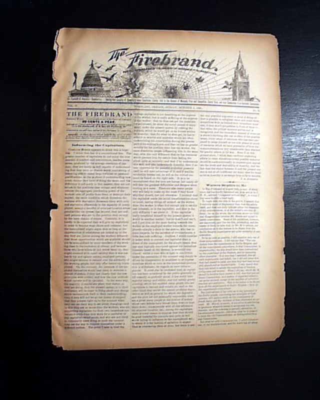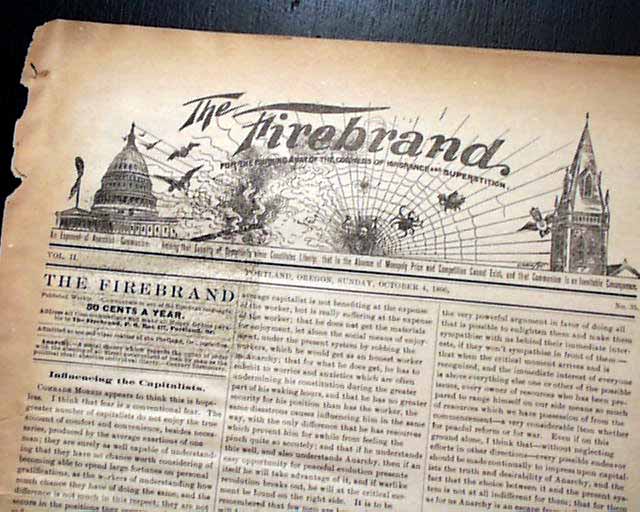 THE FIREBRAND, Portland, Oregon, Oct. 4, 1896  A fascinating newspaper with their motto just under the title: "For the Burning Away of the Cobwebs of Ignorance and Superstition." and the dateline notes: "An Exponent of Anarchist - Communism. Holding that Equality of Opportunity alone Constitutes Liberty; that in the Absence of Monopoly Price and Competition Cannot Exist, and that Communism is an Inevitable Consequence." as noted in Wikipedia (see hyperlink) "The Firebrand" was established in 1895 by the Isaak family. The organization served as "the headquarters of anarchist activity on the West Coast", staunchly advocating free love and women's rights, and critiqued "Comstockery"—censorship of sexual information.