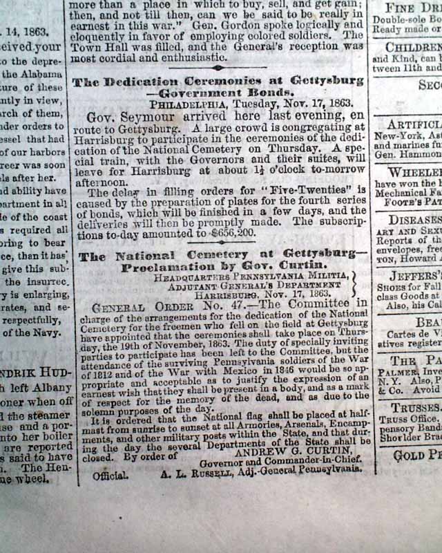 A report headed: "The Dedication Ceremonies at Gettysburg..." mentions that: "...A large crowd is congregating at Harrisburg to participate in the ceremonies of the dedication of the National Cemetery on Thursday. A special train, with the Governors & their suites, will leave for Harrisburg..." with a bit more. This is followed by: "The National Cemetery at Gettysburg--Proclamation by Gov. Curtin", of Penna., with the fine text as seen in the photos.