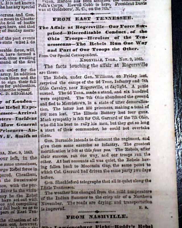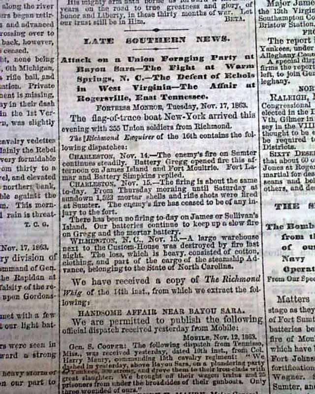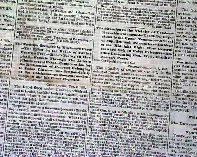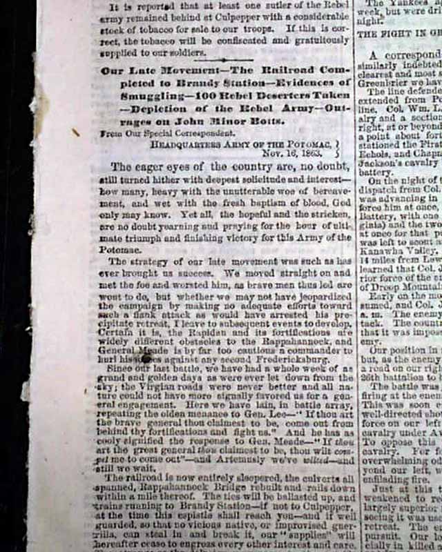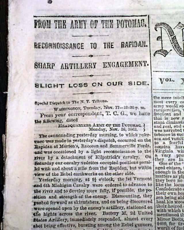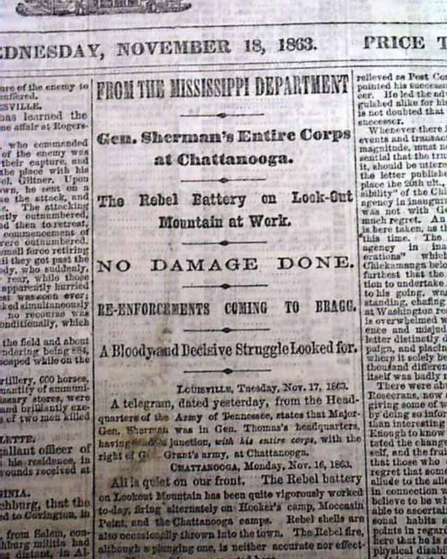 Among the front page column heads on the Civil War are: "Reconnaissance To the Rapidan" "Sharp Artillery Engagement" "Slight Loss on Our Side" "Gen. Sherman's Entire Corps at Chattanooga" "The Rebel Battery on Look-Out Mountain at Work" "Re-Enforcements coming to Bragg" "A Bloody & Decisive Struggle Looked For" and more.
