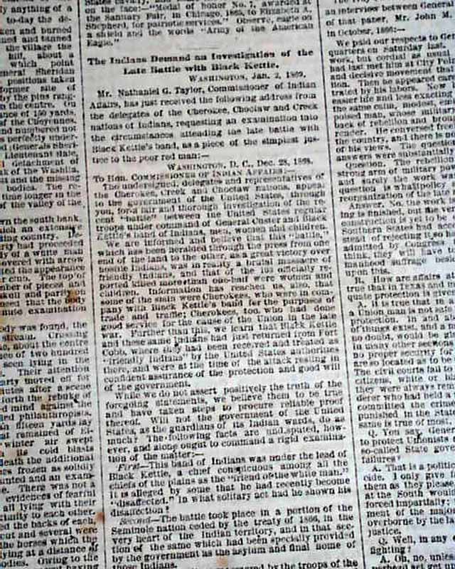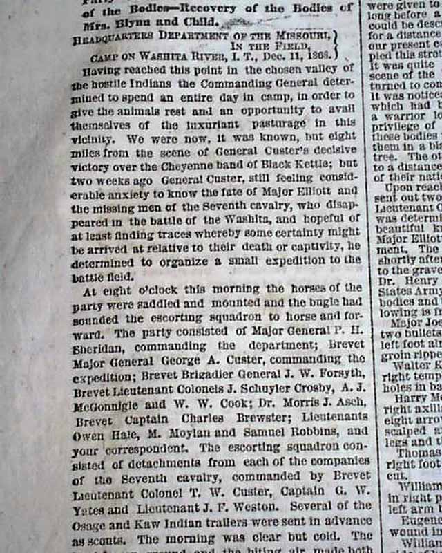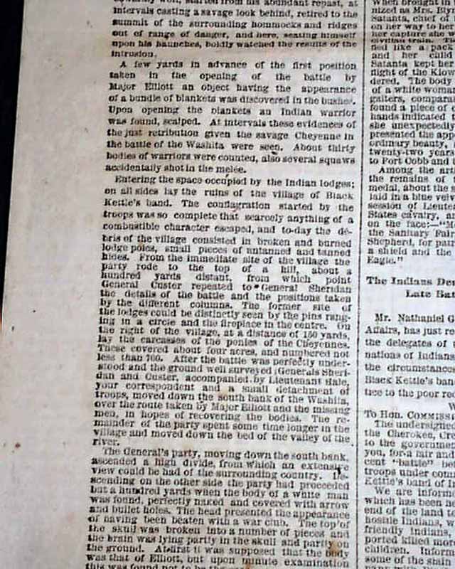 Page 6 has an article headed: "THE INDIAN WAR" "Visit to the Scene of the Recent Battle" "Discovery of the Bodies of Major Elliott and Fifteen Soldiers" and more. Text takes up over 2 1/2 columns.