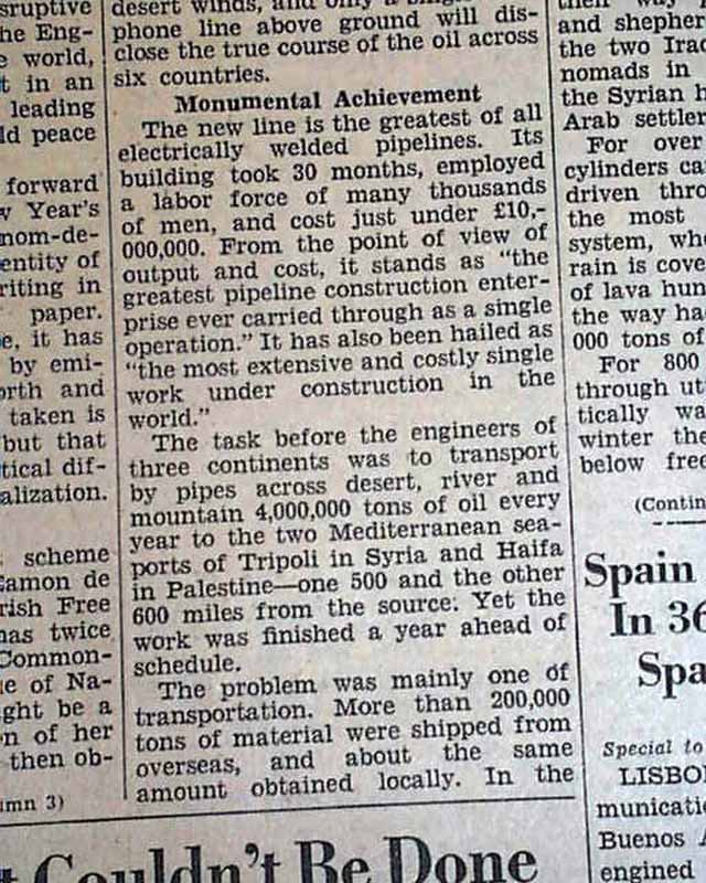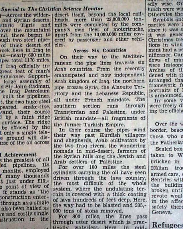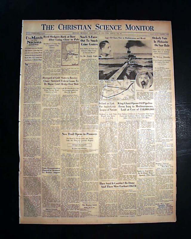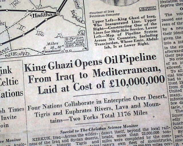The front page has two column headings that include: "King Ghazi Opens Pipeline From Iraq to Mediterranean, Laid at Cost of $10,000,000" and more with related pictorial. (see)