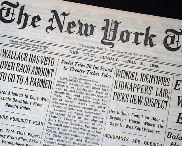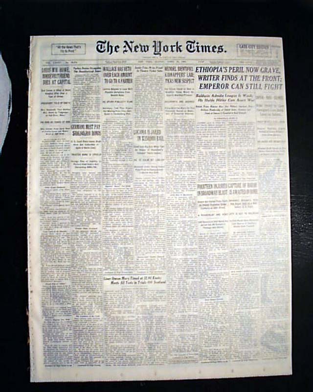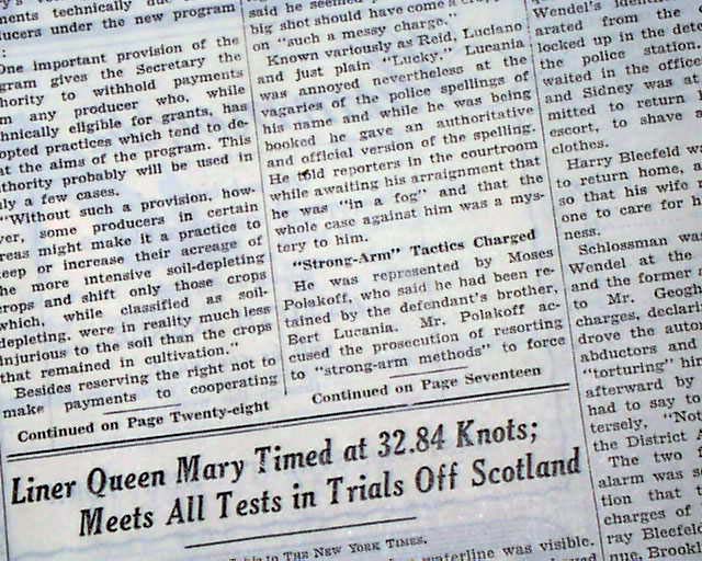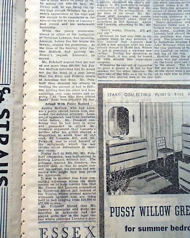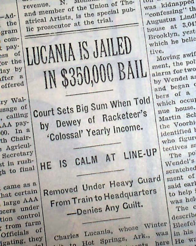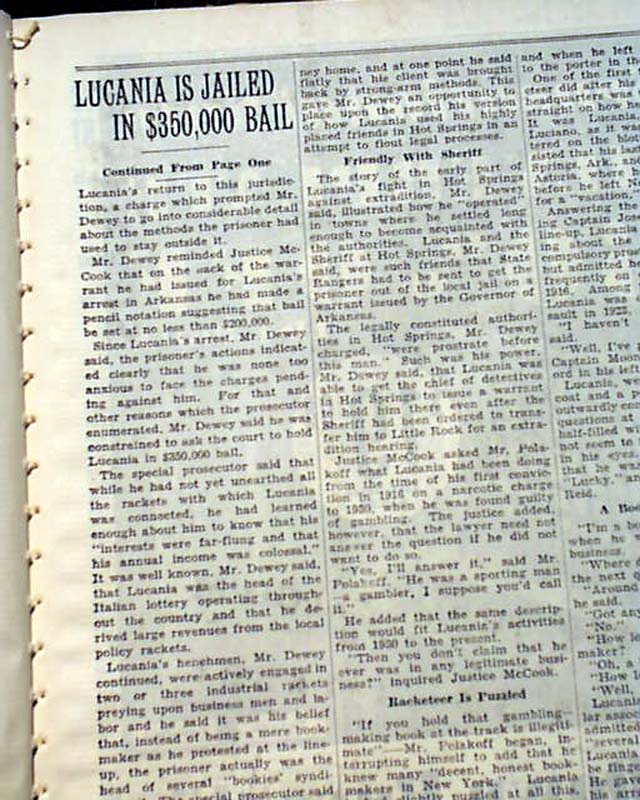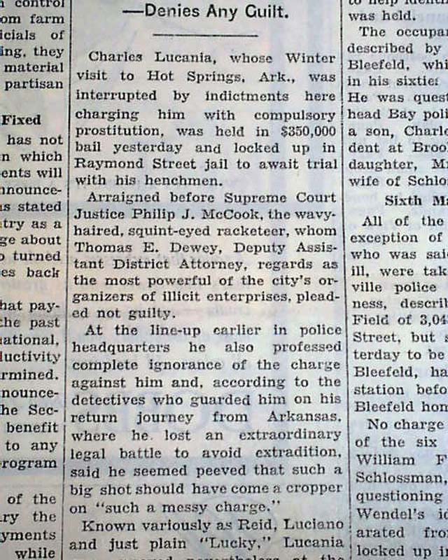 "Court Sets Big Sum When Told by Dewey of Racketeer's 'Colossal' Yearly Income" and more. 1st report coverage on the arrest of Charles "Lucky" Luciano for running a prostitution ring in New York City. This arrest would ultimately send him to prison for about 9 years. Nice to have in this famous NYC title.