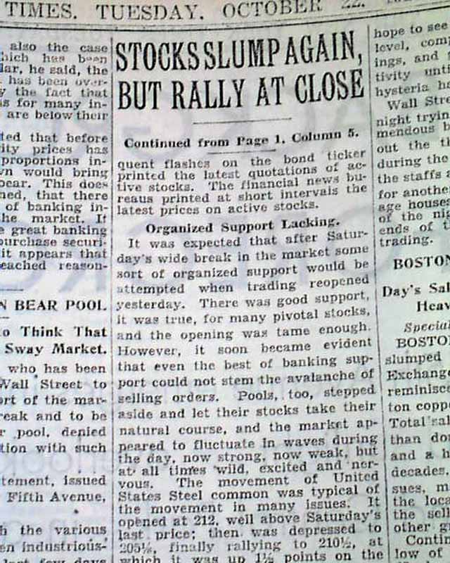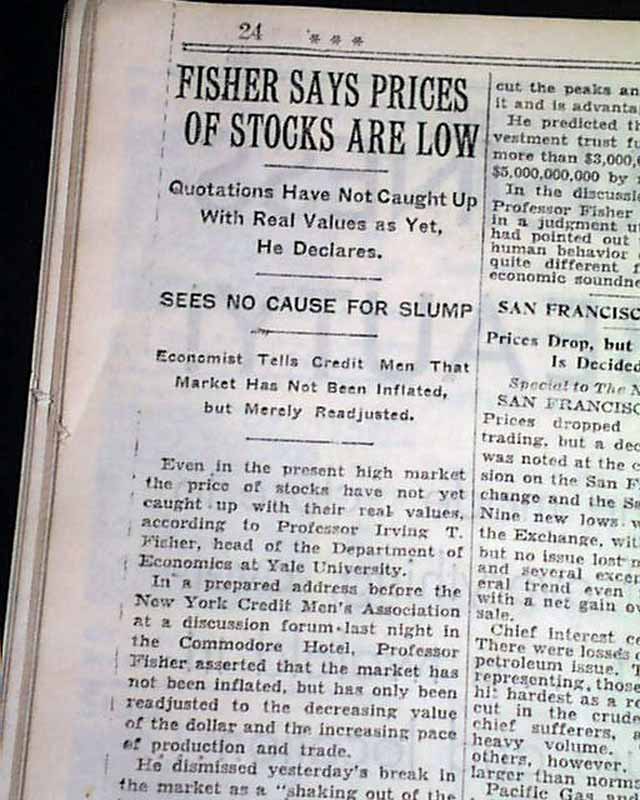 Given that the stock exchange is in New York City, the "Times" remains one of the most desired of all newspapers on the crash. The top of the front page has column heads including: "STOCKS SLUMP AGAIN, BUT RALLY AT CLOSE ON STRONG SUPPORT" "Continuation of Selling Wave Depresses Most of List in Day of Exciting Trading" "Some Issues Show Gains" and more (see). Related text takes most of a column & carries over to page 24 as well. Page 24 has an interesting, related article with column heads: "Fisher Says Prices Of Stocks Are Low" "Quotations Have Not Caught Up With Real Values as Yet, He Declares" "Sees No Cause For Slump" (see for beginning).