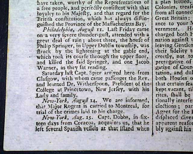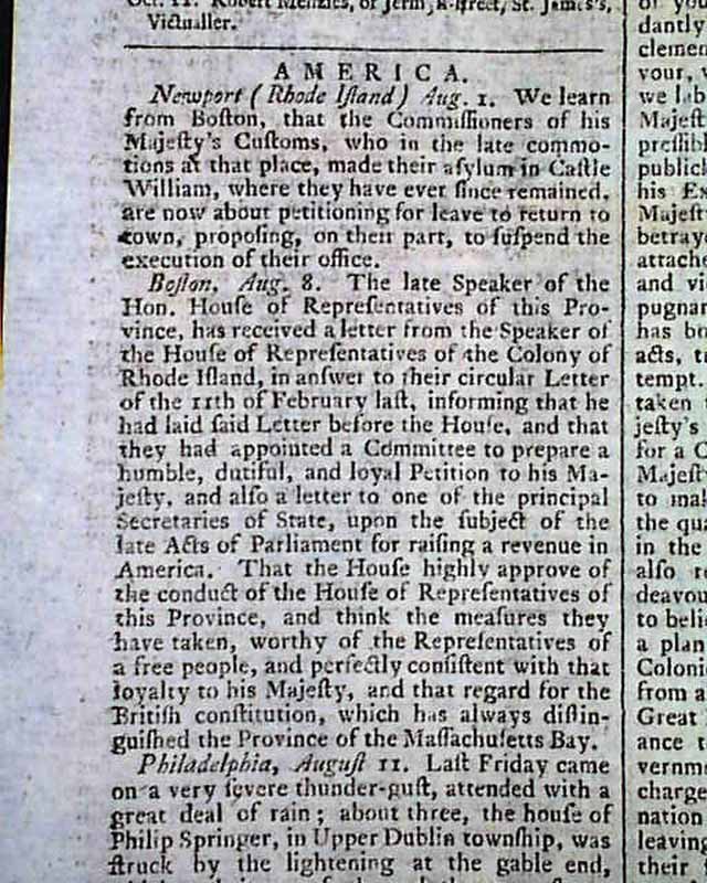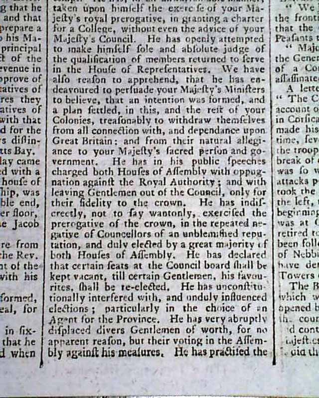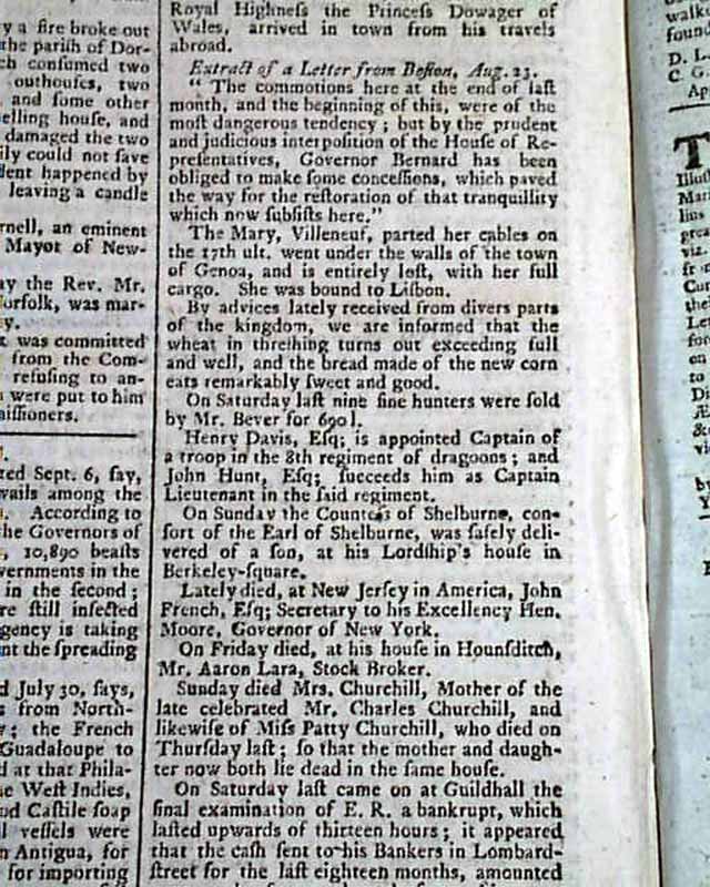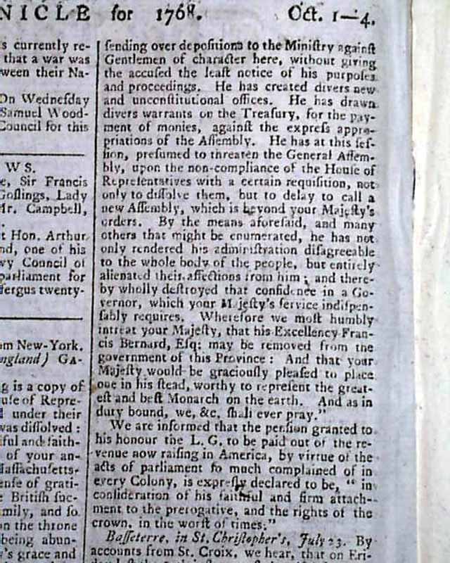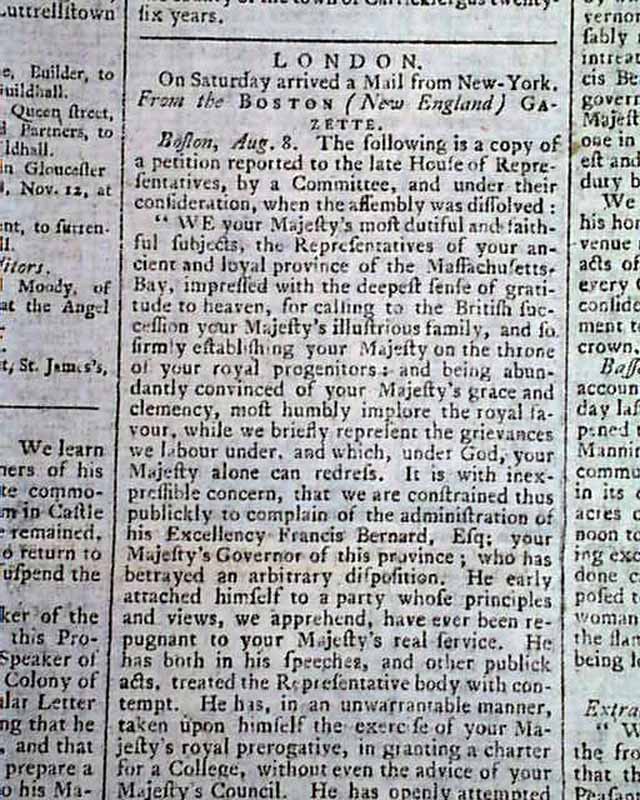 Page 2 has over half a column of reporting with news headed: "America" includes items from Newport, Boston, Phila., and New York, topics including the raising of revenue in the colonies, and a note that: "...Major Rogers is carried to Montreal for trial of the crimes laid to his charge." Also a lengthy report from Boston being a lengthy complaint by those from Boston of Governor Francis Bernard, noting: "...complain of the administration of his Excellency Francis Bernard...has treated the representative body with contempt...he has endeavoured to persuade your Majesty's ministers to believe that...a plan was settled...& the rest of your colonies, treasonably to withdraw themselves from all connection with & dependence upon Great Britain...." with more complaints (see). A notable & very early reference to the colonies seeking independence from England.