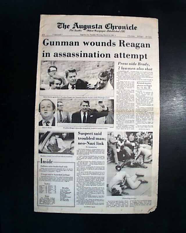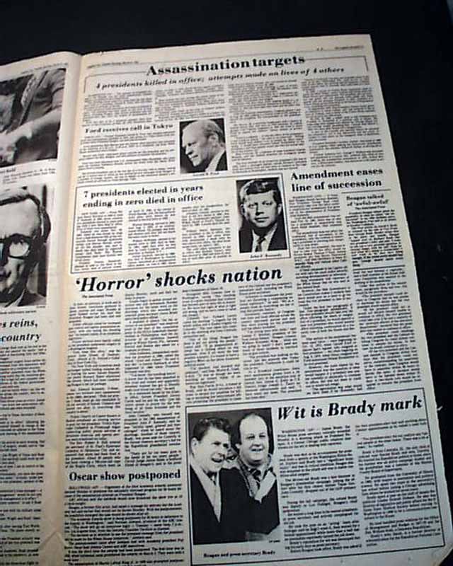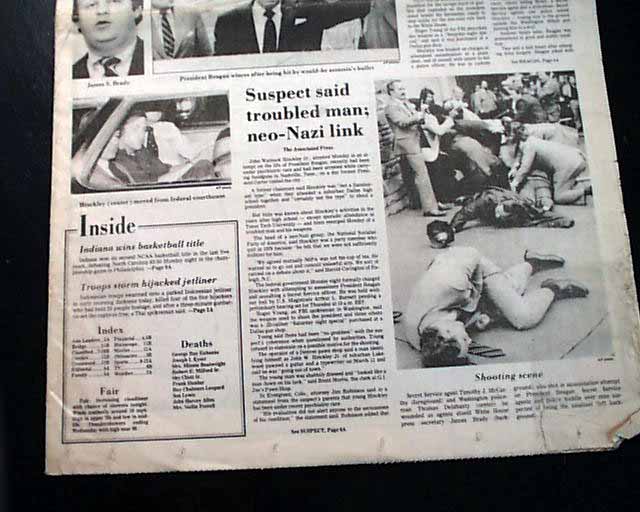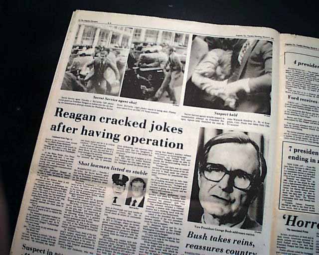 The front page features a banner headline: "Gunman wounds Reagan in assassination attempt" with subheads and 4 related photos. (see) More inside.