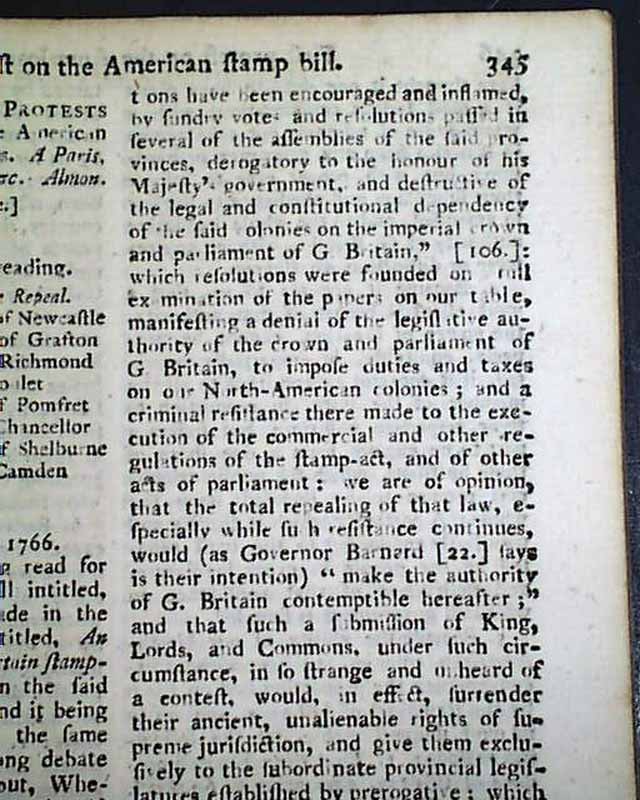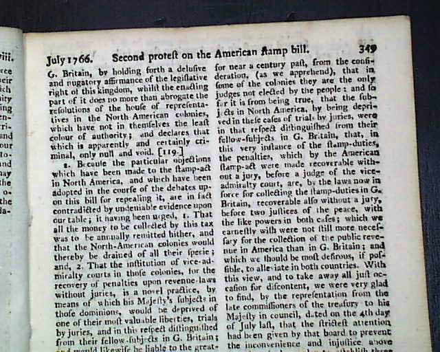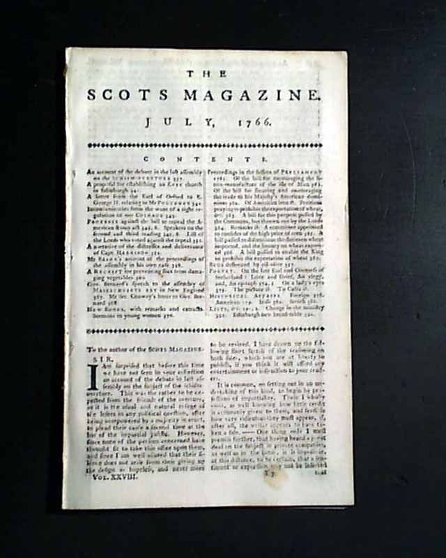 THE SCOTS MAGAZINE, Edinburgh, Scotland, July, 1766  Although formatted much like the more common "Gentleman's Magazine" this is a much more scarce title. Inside has great content from Parliament headed: "First Protest on the American Stamp Bill" being arguments against appeal the Act. This is followed by close to 3 pages of the: "Second Protest on the American Stamp Bill". Interesting content providing an insight as to how  controversial the Stamp Act was even in England.