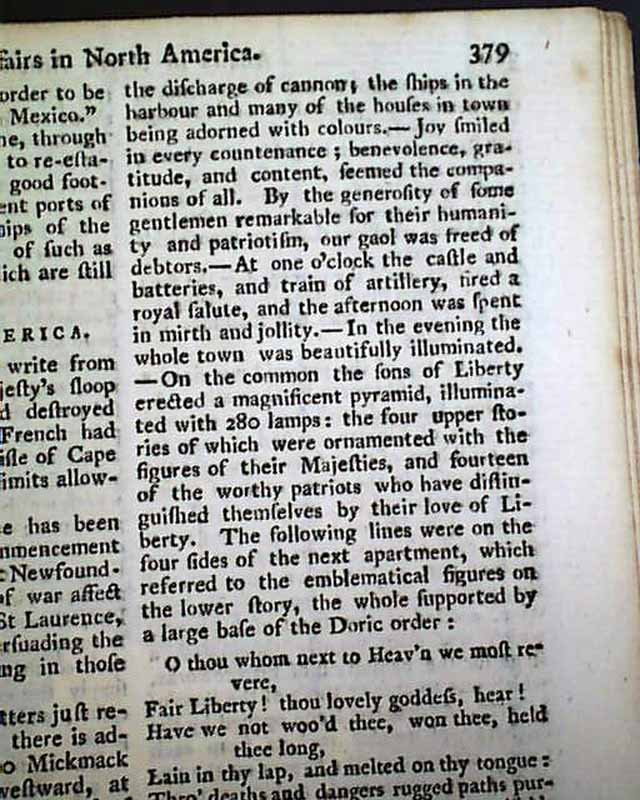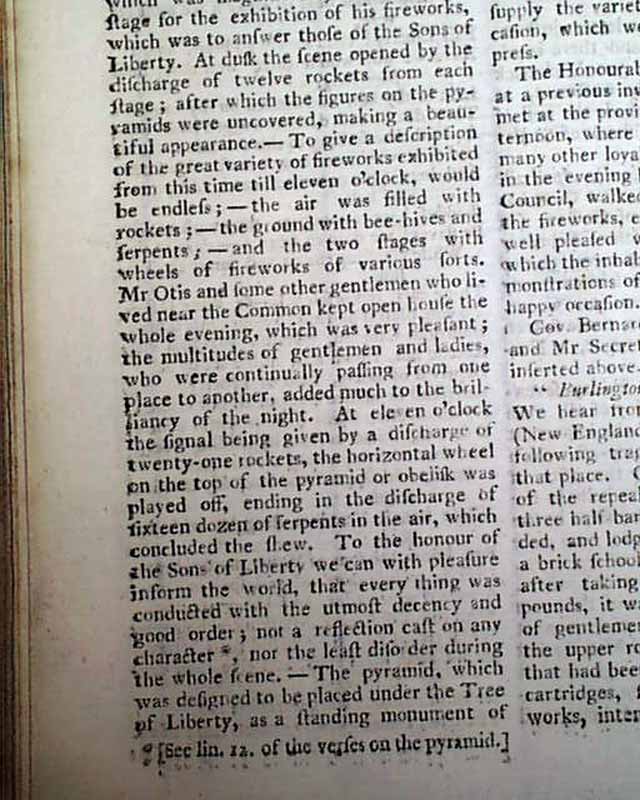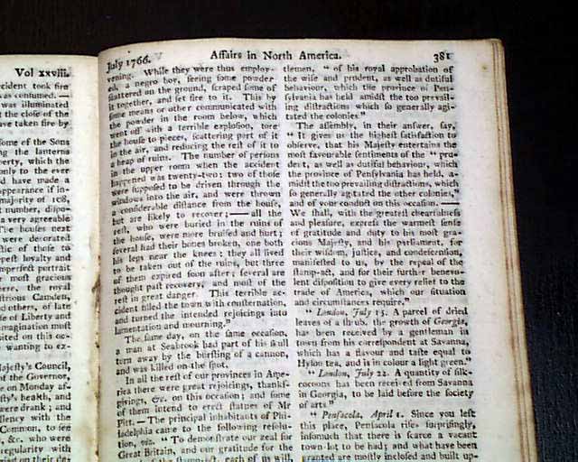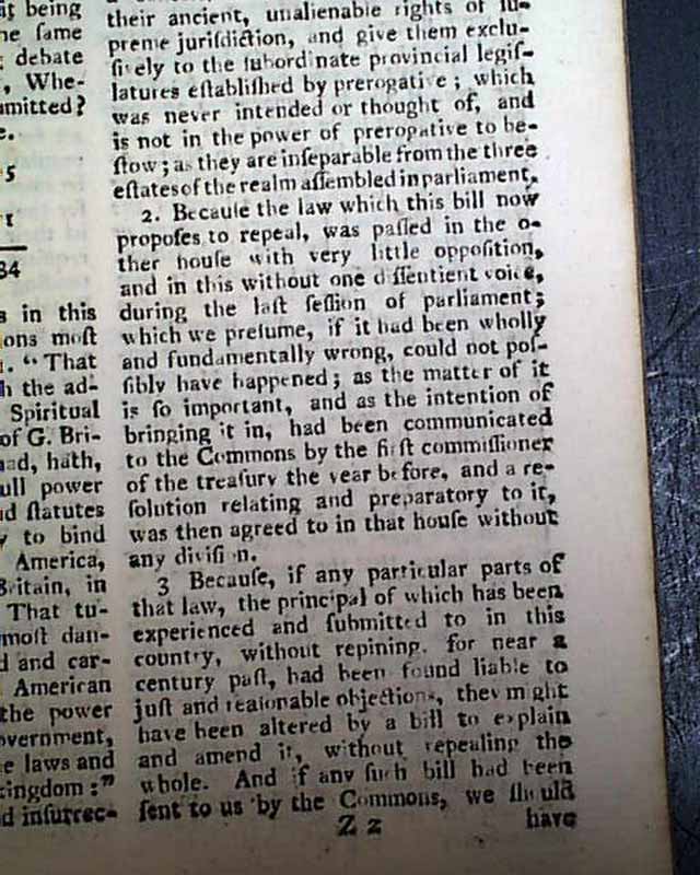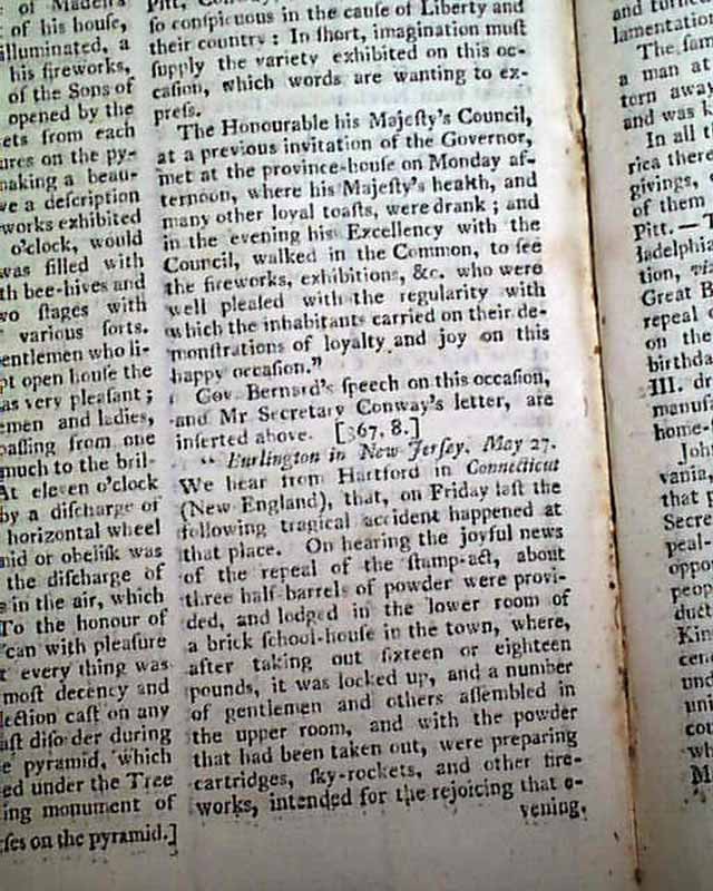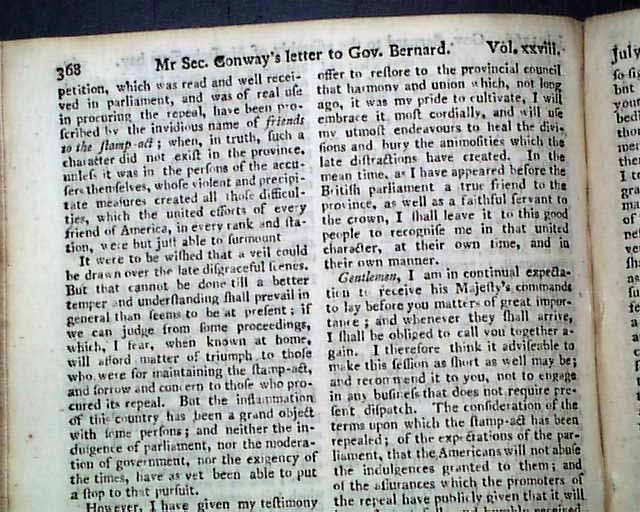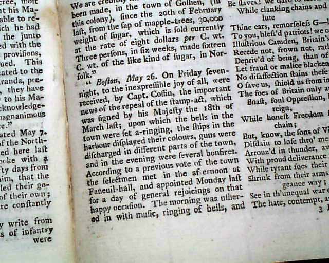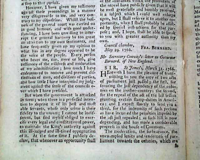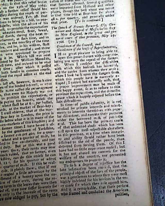 Further on is: "The Speech of Francis Bernard, Gov. & Admiral of Massachusetts Bay..." to his Assembly, with a response to him, all this taking over 2 pages. Also: "British North America" news with fishing concerns, an item from Boston: "...to the inexpressible joy of all, were received...the important news of the repeal of the stamp act which was signed by his Majesty the 18th of March...the bells in the town were set a-ringing, the ships in the harbour displayed their colours, guns were discharged..." and more. Other items concerning news of the Stamp- Act repeal, plus more.