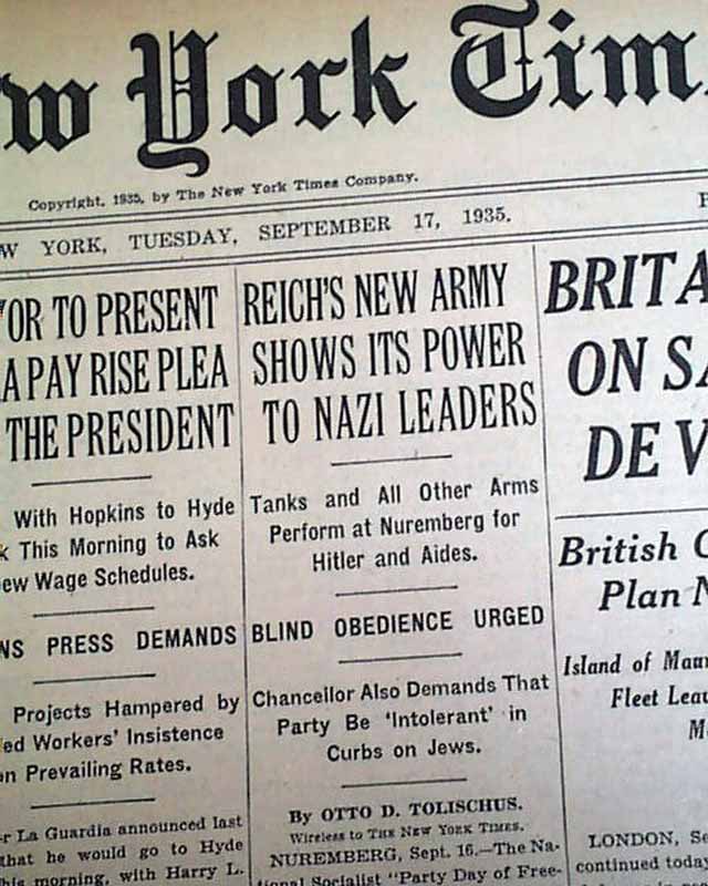 Page 14 has one column headings: "GERMANY CHANGES TO SWASTIKA FLAG" "Obeys Hitler Decree, Although Ship Men Regret Similarity to Soviet Banner" "JEWS HAVE OWN COLORS" "Imperial Black, White and Red Expected to Be Used at Frontiers and on Mail Boxes" (see) Also front page reporting on the Nuremberg Rally held the night before.