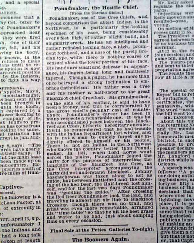 Page 3 has an illustration of: "Poundmaker, the Hostile Chief" with a nice article onn him beginning: "Poundmaker, one of the Cree Chiefs, and beyond comparison the ablest Indian in the Northwest, is a particularly fine looking specimen of his race..." with more on him (see). Rare to find such prints in period newspapers.