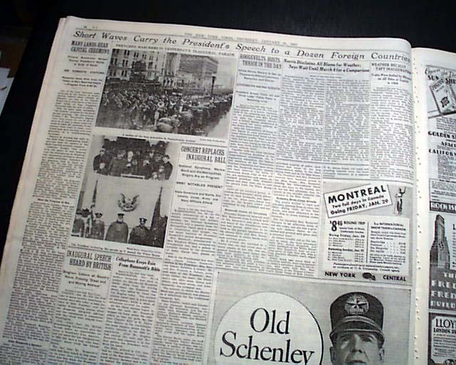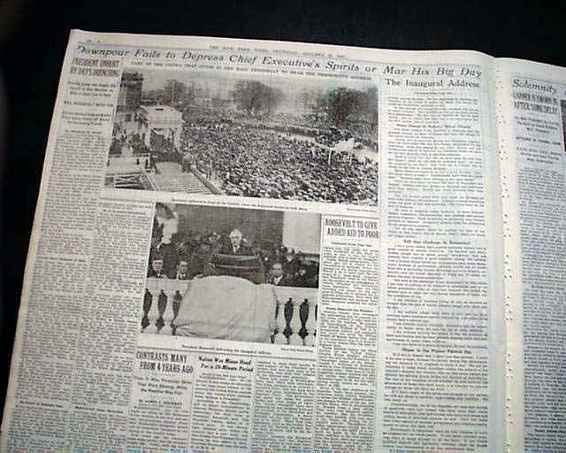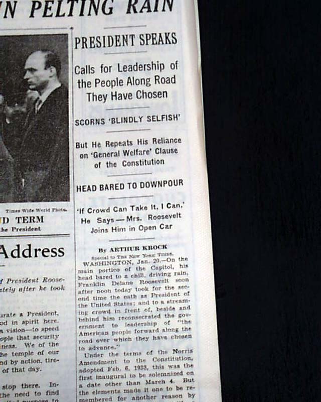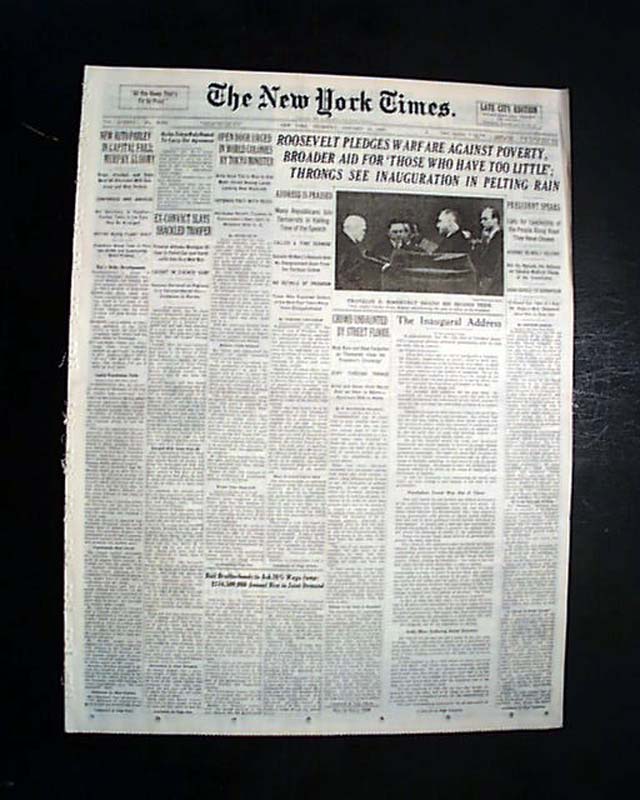 The top of the front page has a five column headline: "ROOSEVELT PLEDGES WARFARE AGAINST POVERTY, BROADER AID FOR 'THOSE WHO HAVE TOO LITTLE'; THRONGS SEE INAUGURATION IN PELTING RAIN" with subheads and photo. Also text of Roosevelt's inaugural address. Coverage continues inside with more photos. Loads of text.