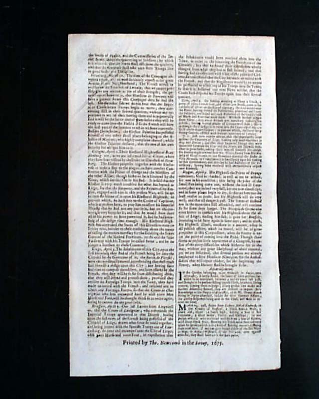 The issue is filled with various news of the day from various cities in Europe, each report with its own dateline, and even includes several "Advertisements" on the back page. Given its small size this would be a nice newspaper for framing & display with the 343 year old date prominent at the top. Nice condition.