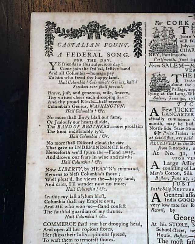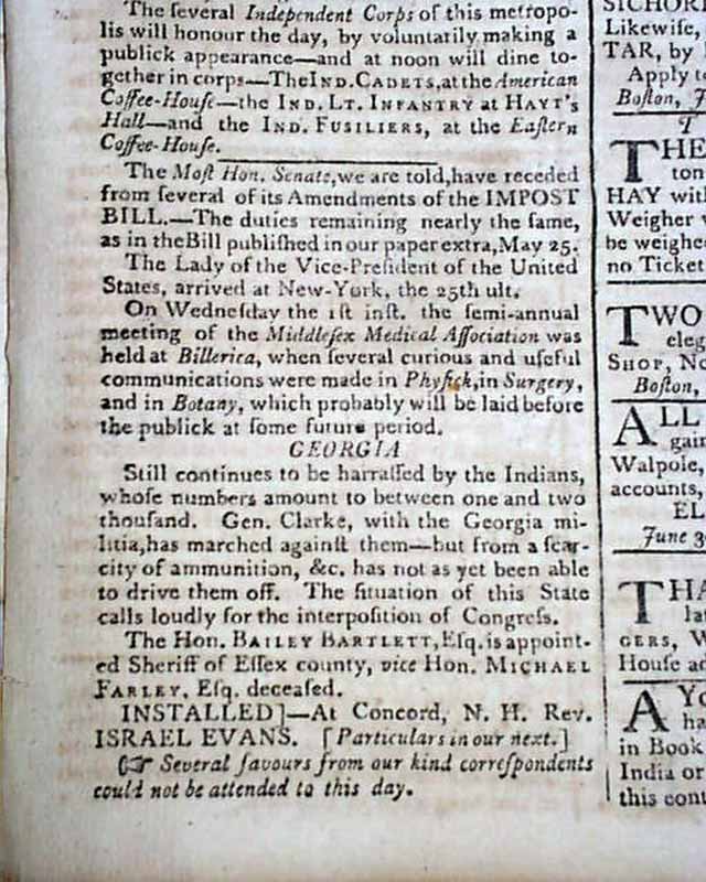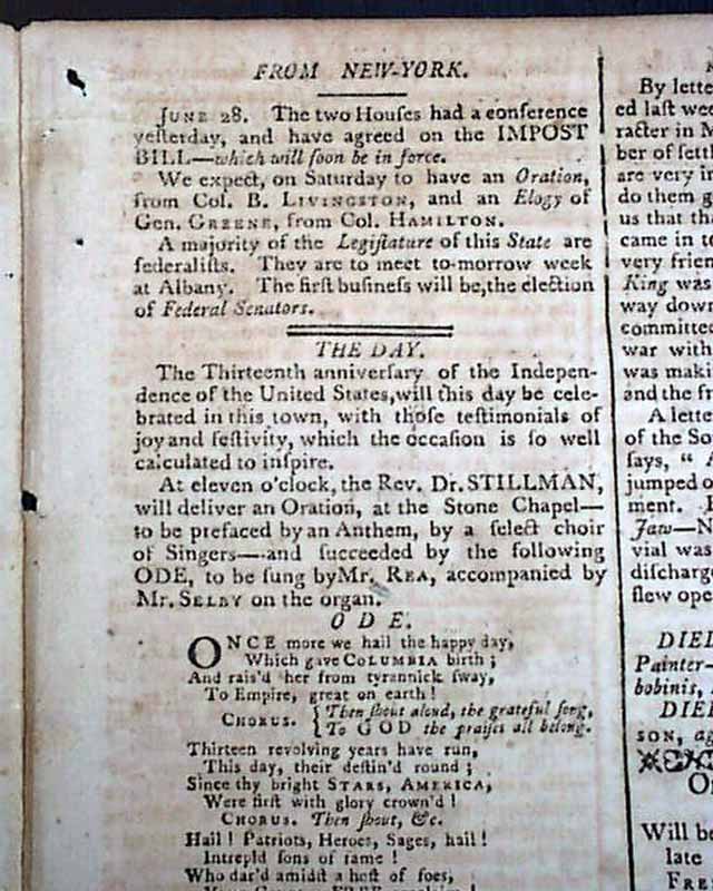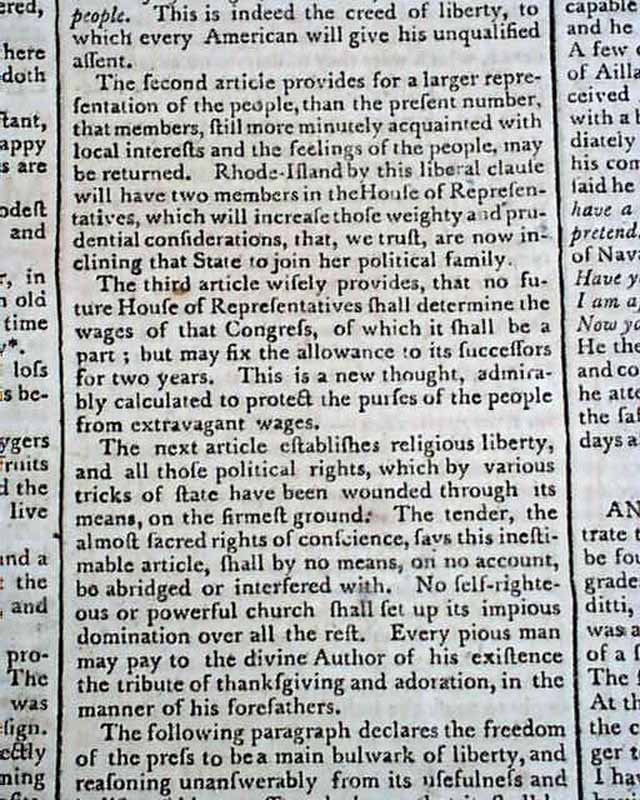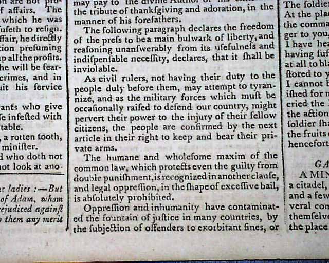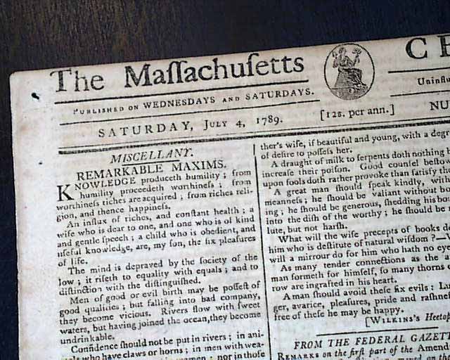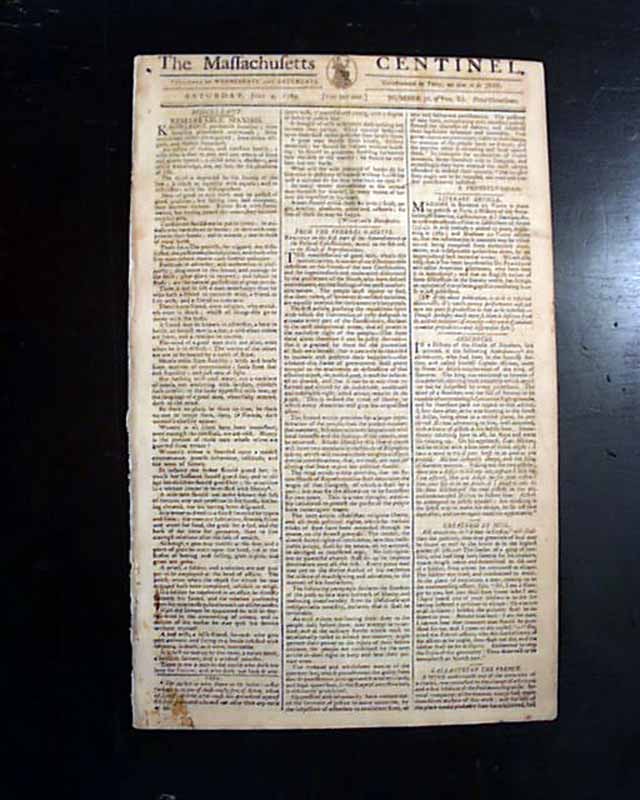 THE MASSACHUSETTS CENTINEL, Boston, July 4, 1789 A great issue as one-third of the front page is taken up with: "Remarks on the First Part of the Amendments to the Federal Constitution, Moved on the 8th inst., in the House of Representatives". Included are specific references to various amendments, such as: "The first article, pursuing the republican spirit with which the Convention of 1787 designed to animate...declares in the most unequivocal terms, that all power is the exclusive right of the people...". "The second article provides for a lager representation of the people than the present number...". "The next article establishes religious liberty and all those political rights...". "The following paragraph declares the freedom of the press to be a main bulwark of liberty..." and much more. Great discussion from the early period of creating a Bill of Rights, not to be concluded for several months.