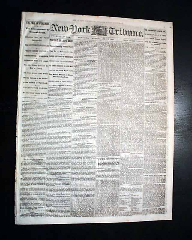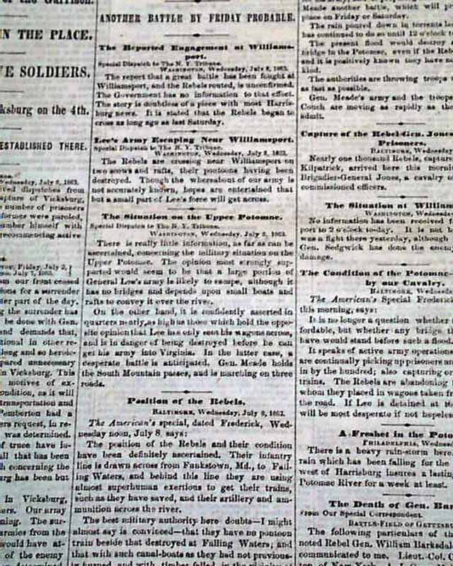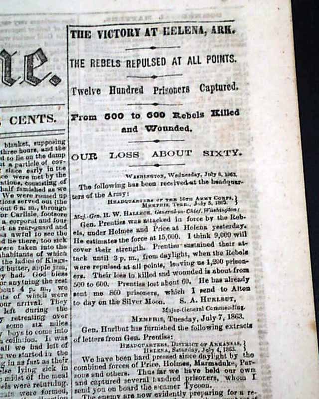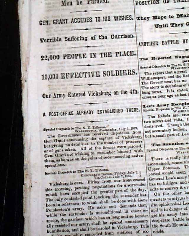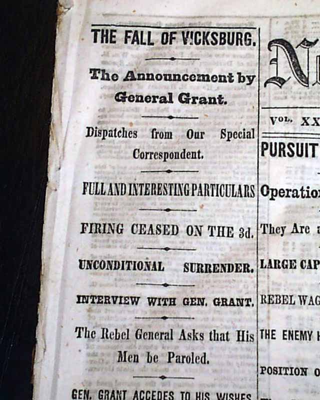 Among the notable column heads on the Front page are: "The Fall of Vicksburg" "The Announcement by General Grant" "Full & Interesting Particulars" "Unconditional Surrender" "Interview With Gen. Grant" "Pursuit of Lee's Army" "Operations by our Cavalry" "Large Captures of Prisoners" "The Enemy Harassed in Every Way" "The Victory at Helena, Arkansas" and much more.
