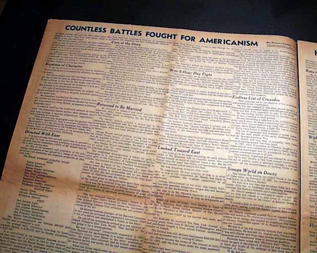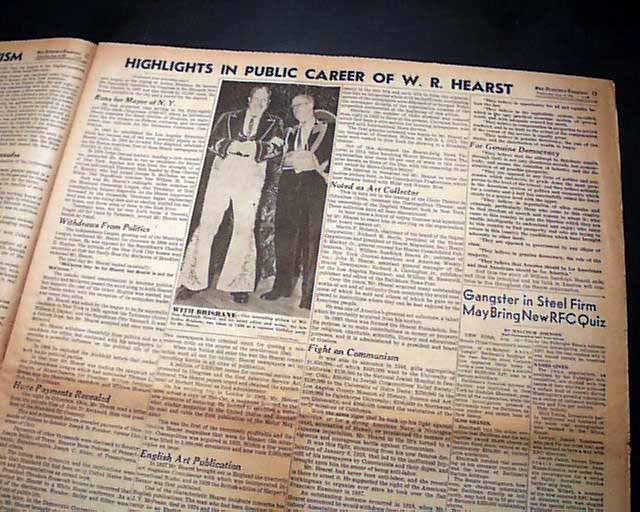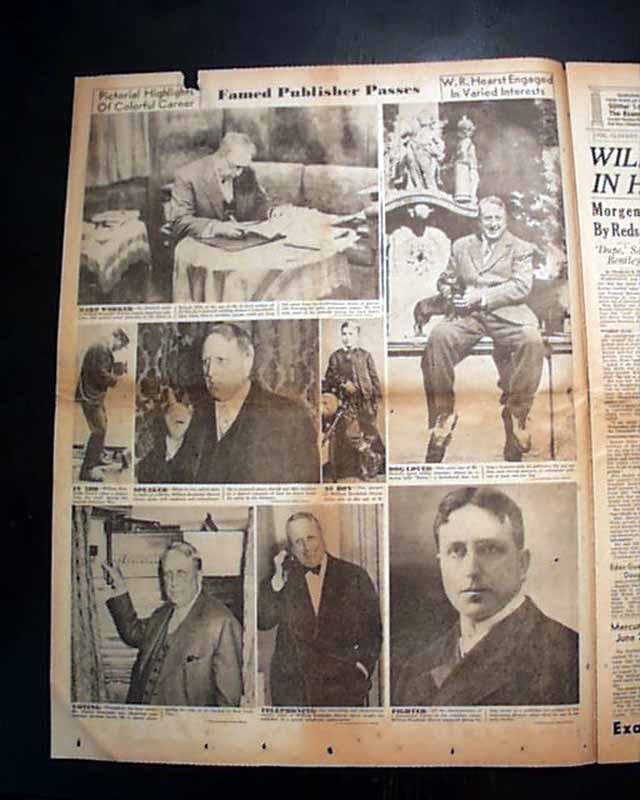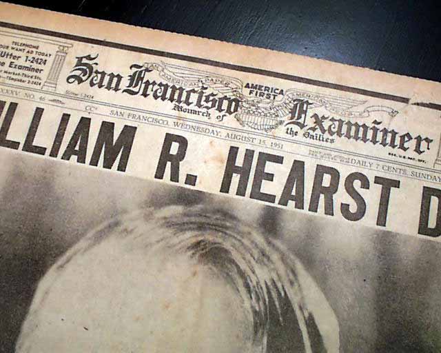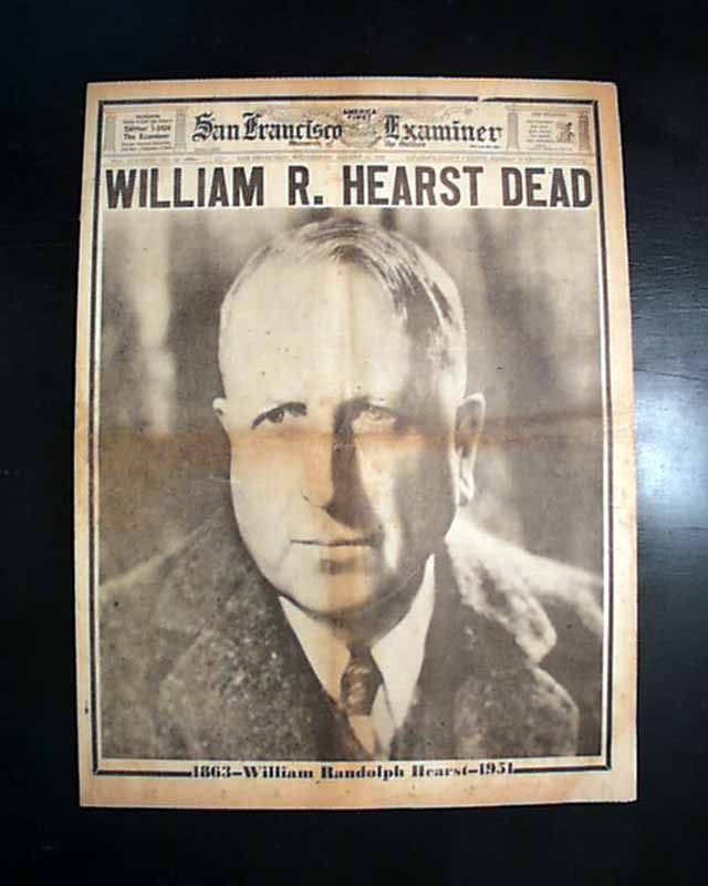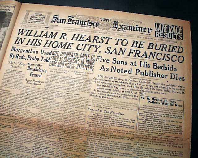Terrific to have such a dramatic presentation on his death on the front page of his flagship newspaper. This front sheet was more of a "wrapper" as another front page appears inside with banner headline: "William R. Hearst To Be Buried In His Home City, San Francisco" with much more.