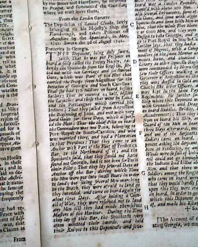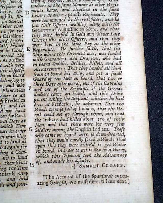 Near the back is a letter prefaced with: "The Deposition of Samuel Cloake...taken Prisoner off Augustine by the Spaniards in May, 1742" with the letter datelined: Frederica in Georgia.