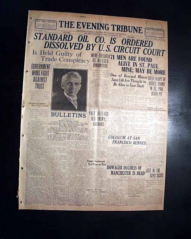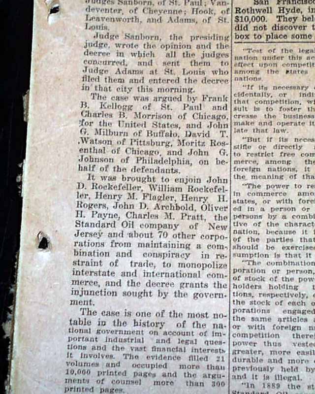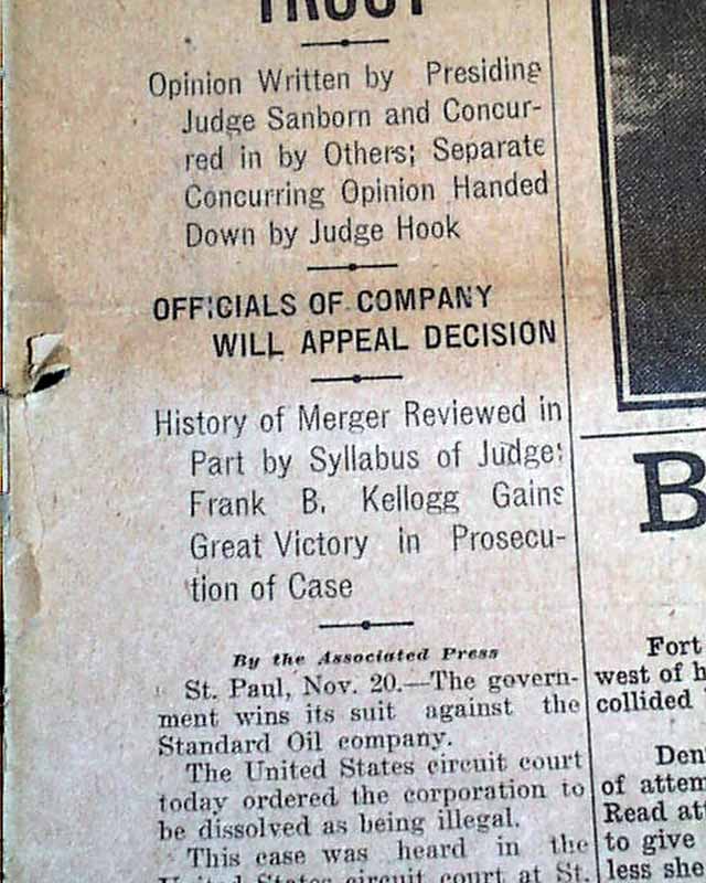 The front page has a nice banner headline: "STANDARD OIL CO. IS ORDERED DISSOLVED BY U.S. CIRCUIT COURT" with subheads and photo of the lead prosecutor, Frank Kellogg. (see) Nice for display. Surprisingly this issue is in good condition being from the "wood pulp" era. Very hard to find issues that are not totally fragile from this era in paper.