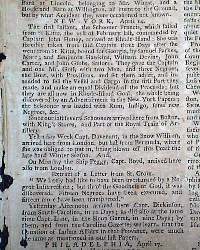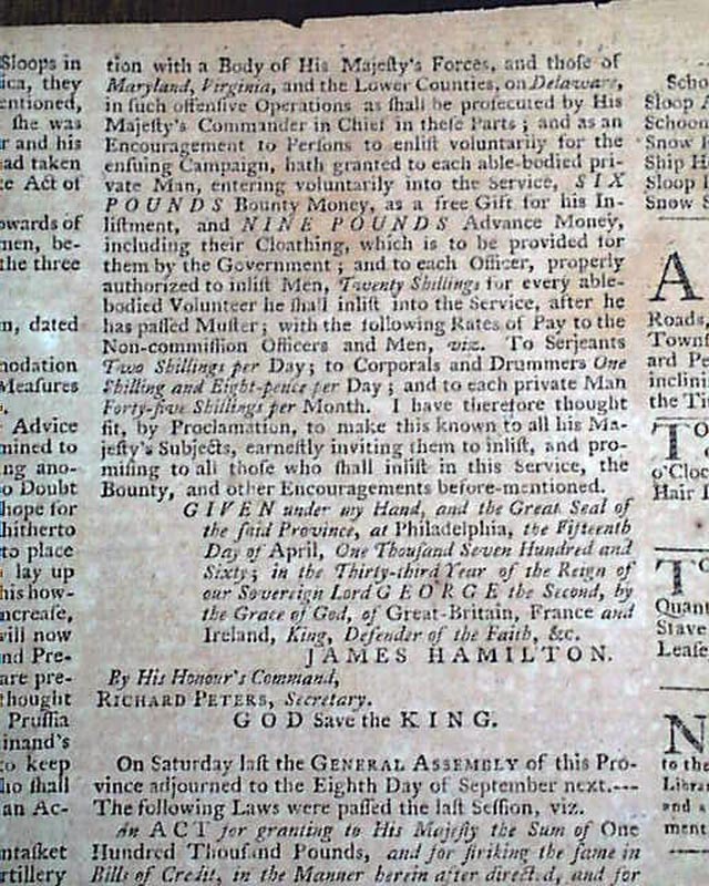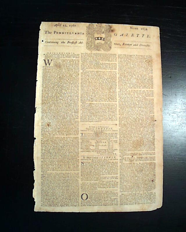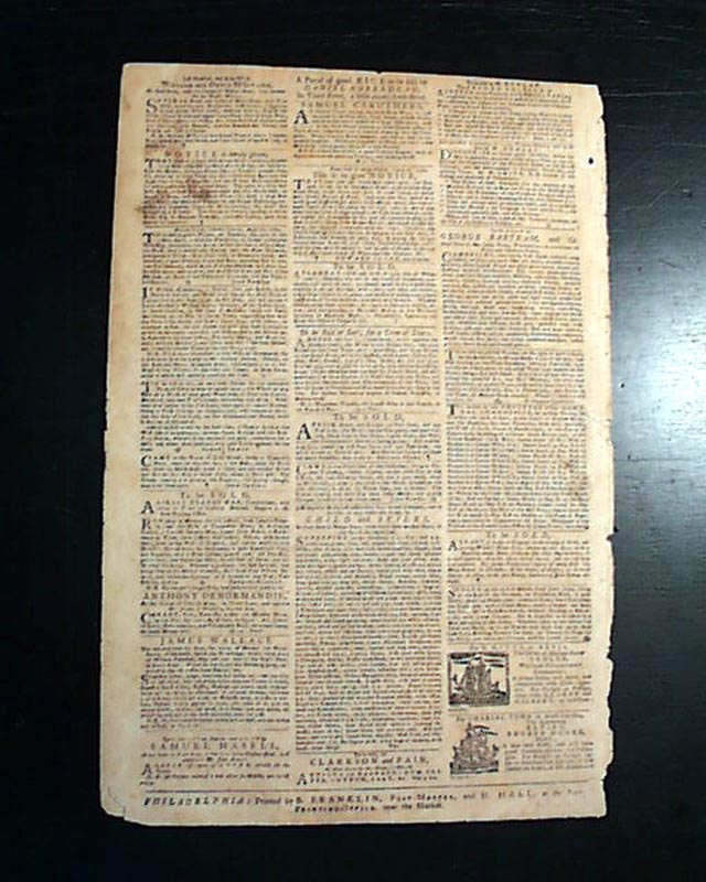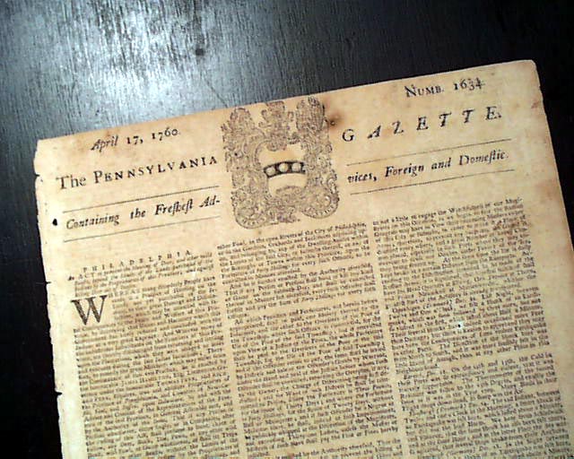 PENNSYLVANIA GAZETTE, April 17, 1760 This is perhaps one of the most famous newspapers of the colonial era, almost entirely because it was printed by Benjamin Franklin as indicated by the imprint at the bottom of the back page which lists him by name, and identifies him as the Postmaster as well: "Printed by B. FRANKLIN, Post-Master, and D. HALL, at the New-Printing-Office, near the Market." Franklin's imprint only appeared in the Pennsylvania Gazette through 1765.