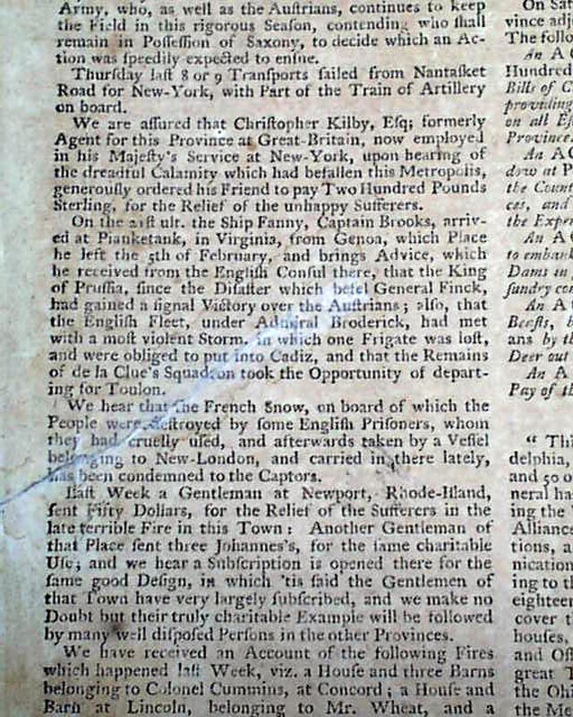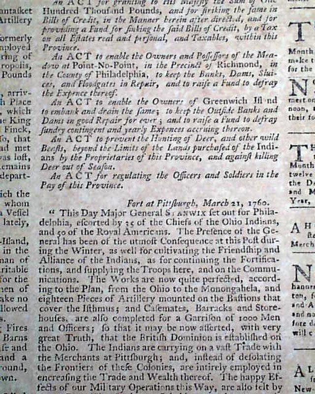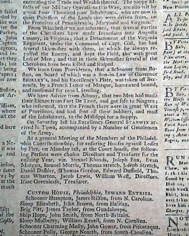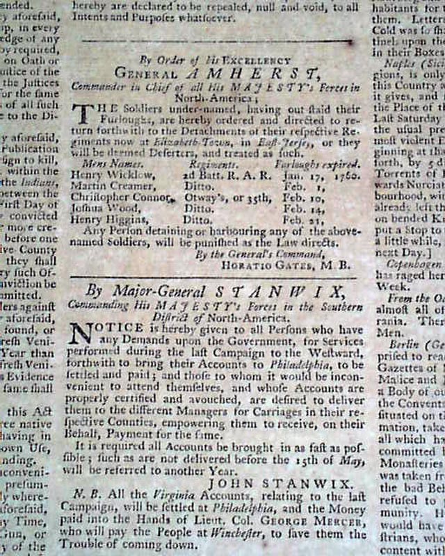 Since this issue was published during the French & Indian War, it is not surprising that the front page has two related Orders, one by General Amherst concerning a list of soldiers who will be deemed deserters if they don't return to their ranks, signed by a name to be more famous in the Revolutionary War: Horatio Gates. The other is signed by John Stanwix.