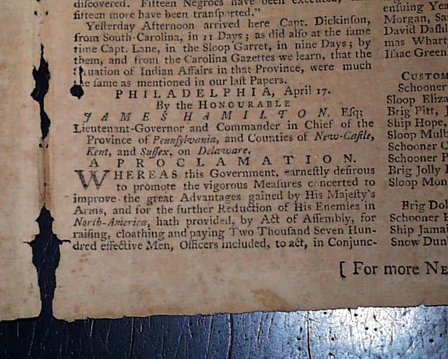 Inside pages have additional reports concerning the French & Indian War as seen in the photos, including: "A Proclamation" signed in type by: James Hamilton.
