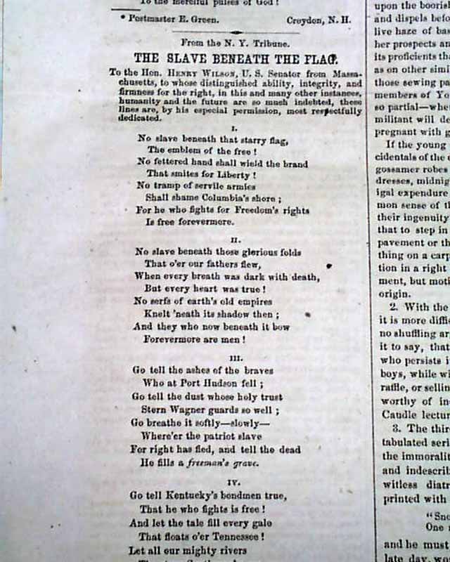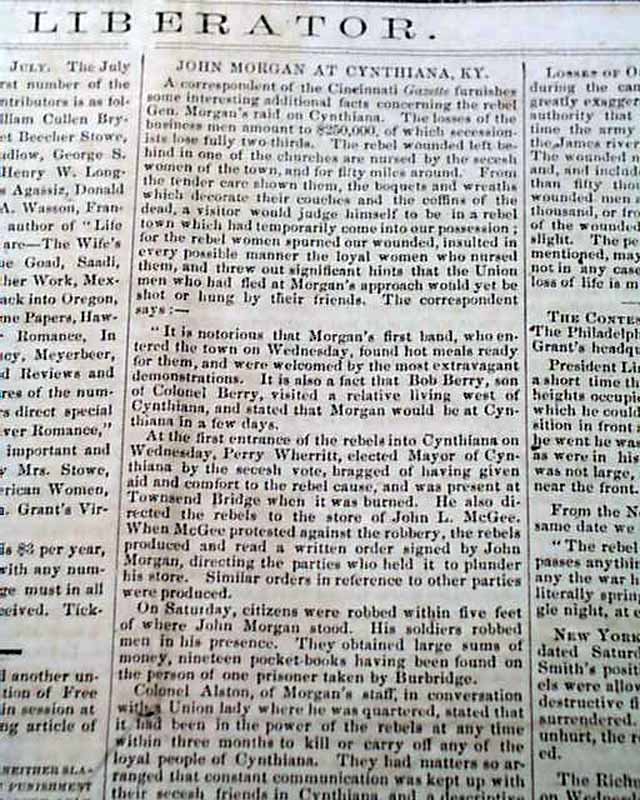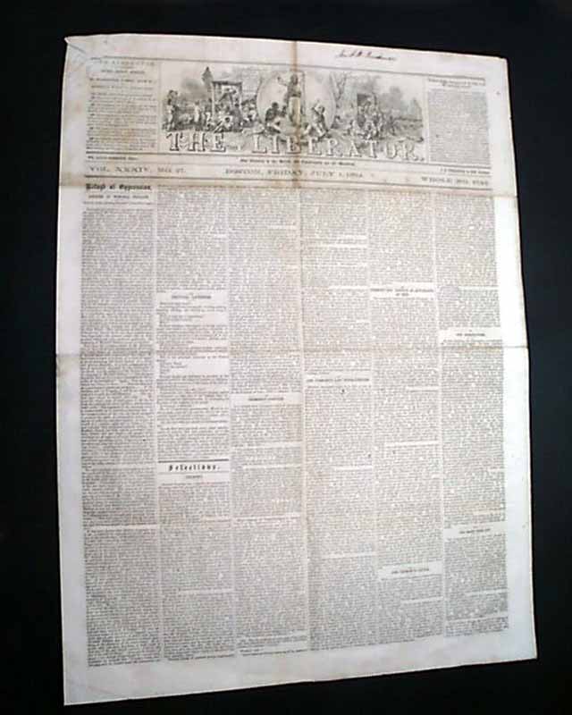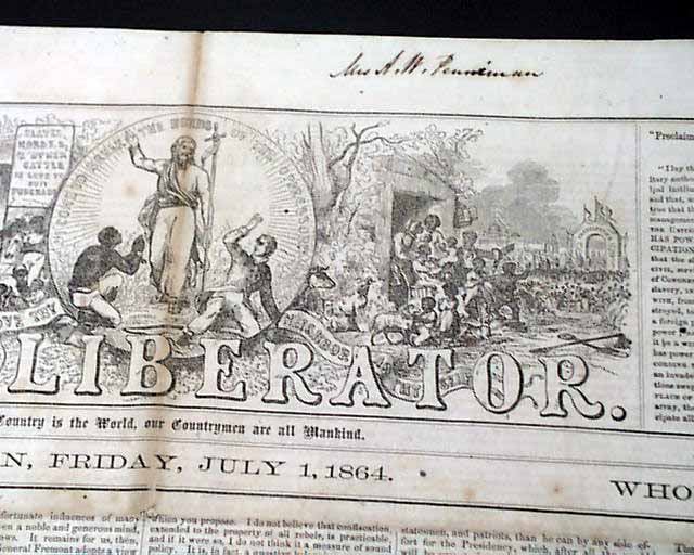 THE LIBERATOR, Boston, July 1, 1864 This is the famous anti-slavery newspaper by famed abolitionist publisher William Lloyd Garrison. The masthead features two engravings, one of a slave auction and the other showing slaves being emancipated.