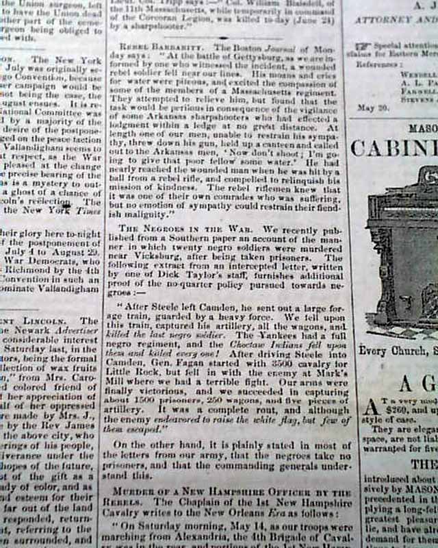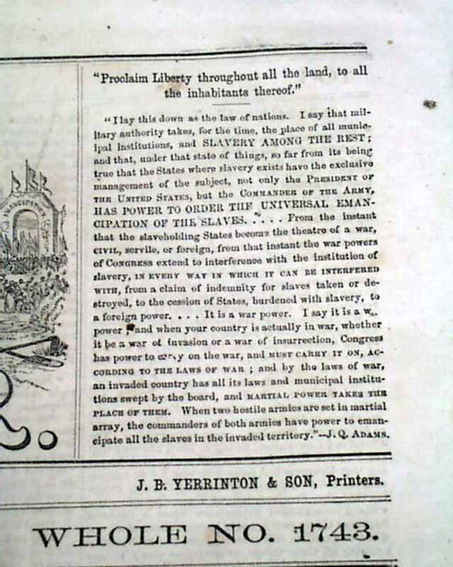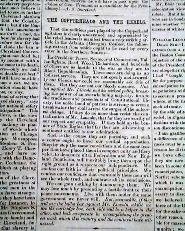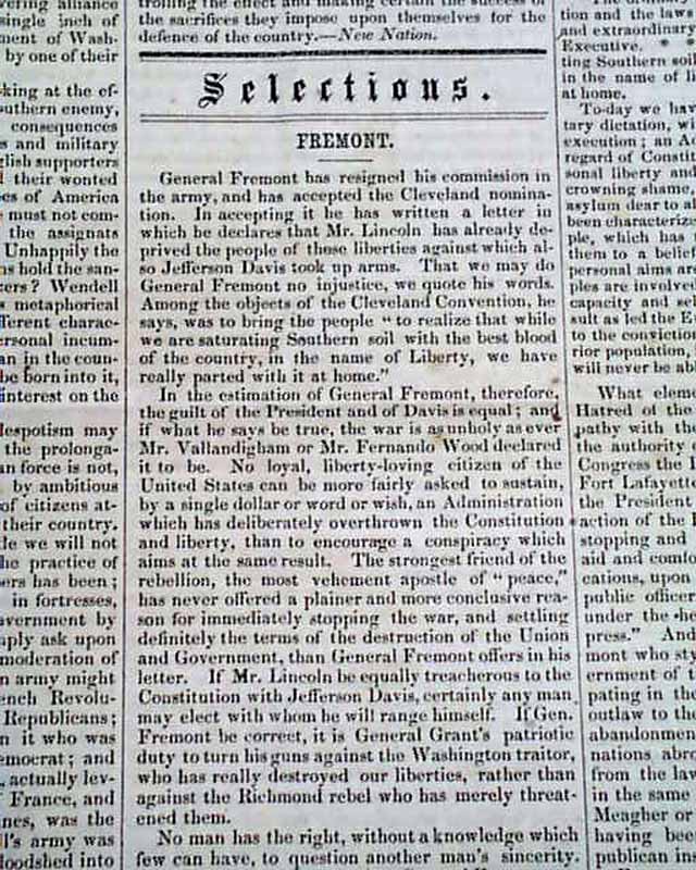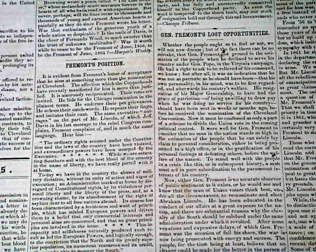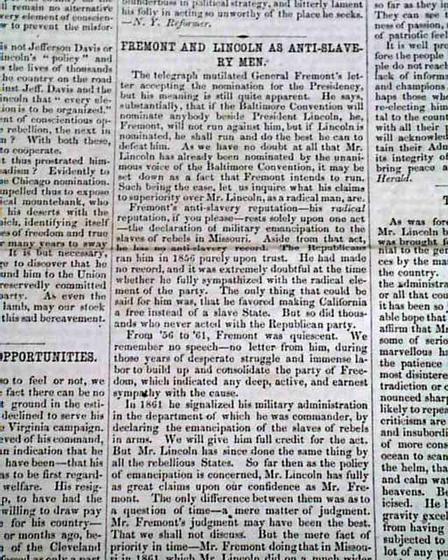 The front page has much concerning General John Fremont and his bid for the Presidency against Lincoln (he would withdraw before the election) including: "Fremont's Position" "Gen. Fremont's Lost Opportunities" "Fremont & Lincoln as Anti-Slavery men" and more.