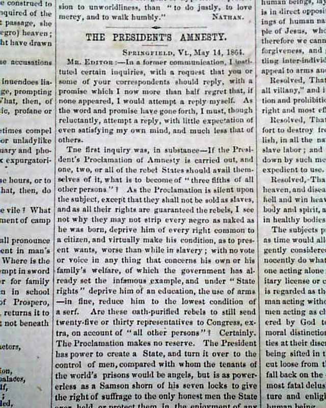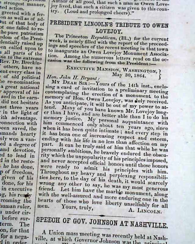 Other articles include: "The Copperheads & the Rebels" "Two Rebel Newspapers Ventilated" "Death of Joshua Coffin" "The President's Amnesty" "President Lincoln's Tribute to Owen Lovejoy" is signed by him: A. Lincoln. Much more regarding the war as well.