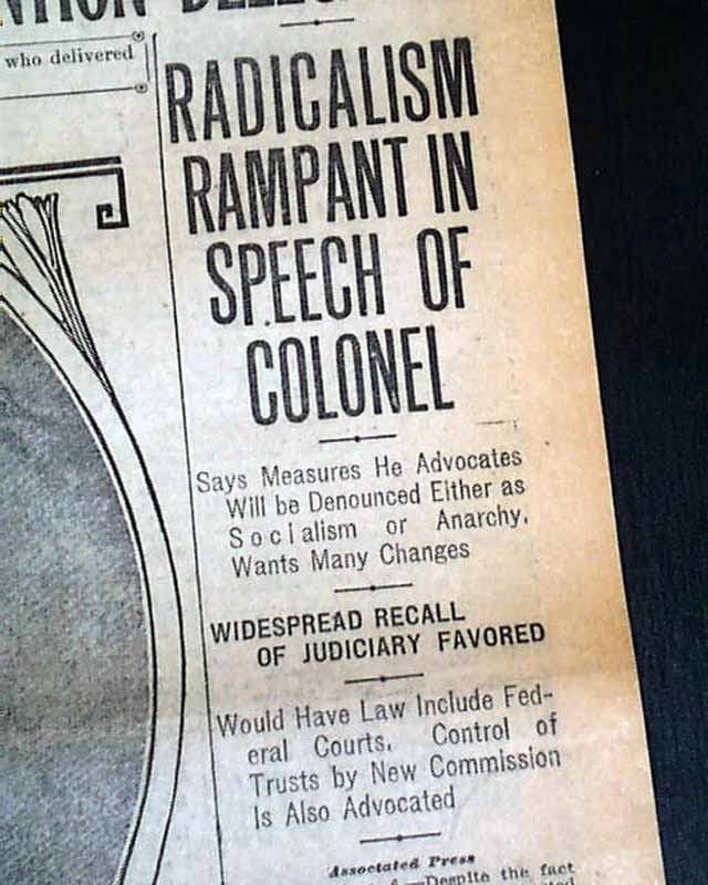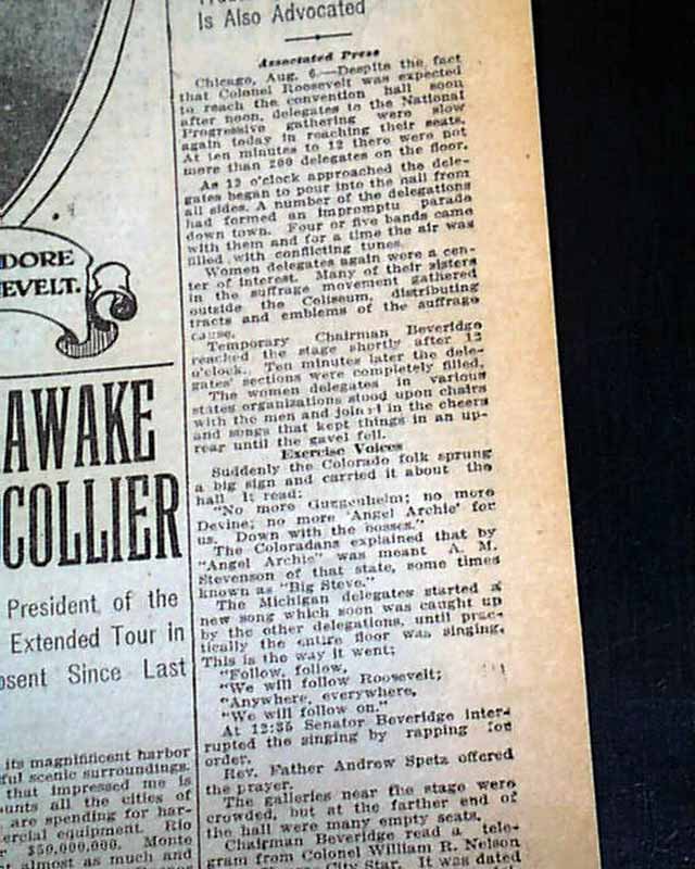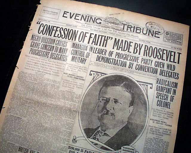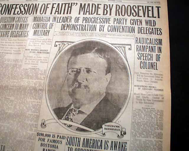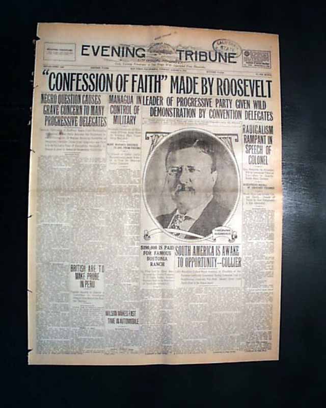 The front page has a nice banner headline: "'CONFESSION OF FAITH' MADE BY ROOSEVELT" with subheads and photo. (see) Nice for display. Surprisingly this issue is in good condition being from the "wood pulp" era. Very hard to find issues that are not totally fragile from this era in paper.