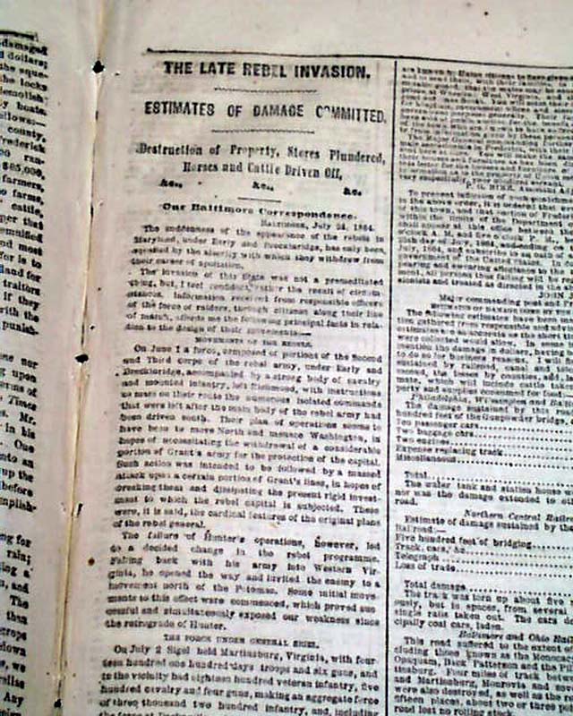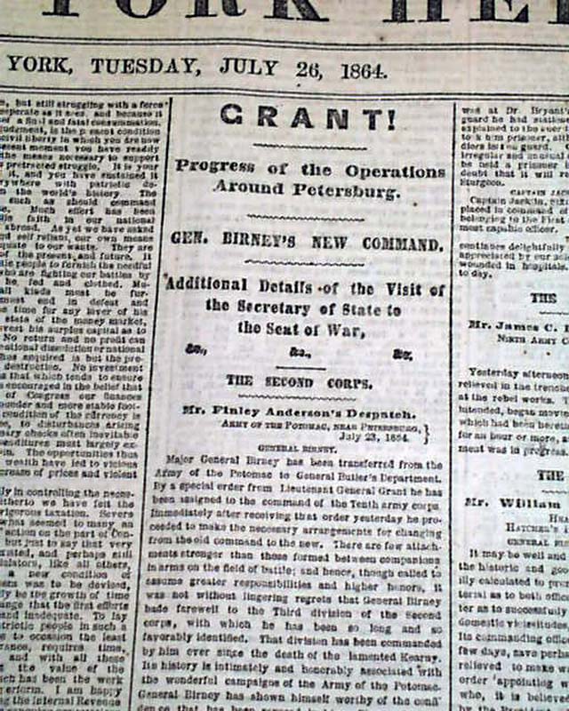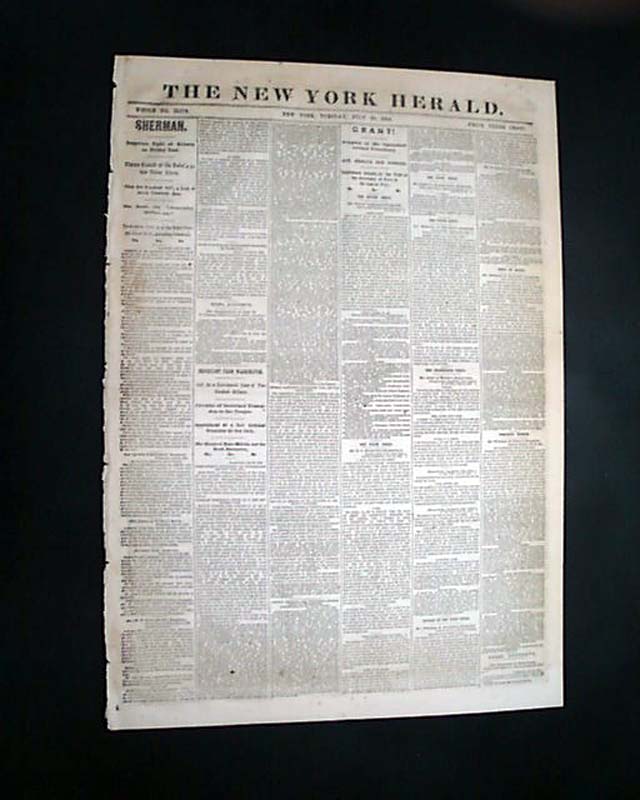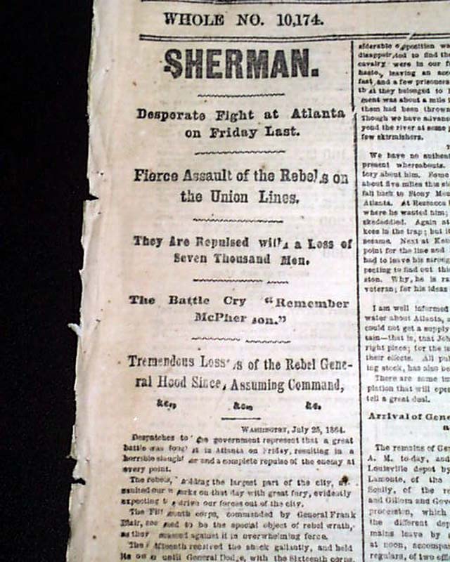 Among the front page column heads on the Civil War are: "SHERMAN" "Desperate Fight at Atlanta on Friday" "Fierce Assault of the Rebels on the Union Lines" "The Are Repulsed with a Loss of 7,000 Men" "GRANT!" "Progress of the Operations Around Petersburg" and much more.