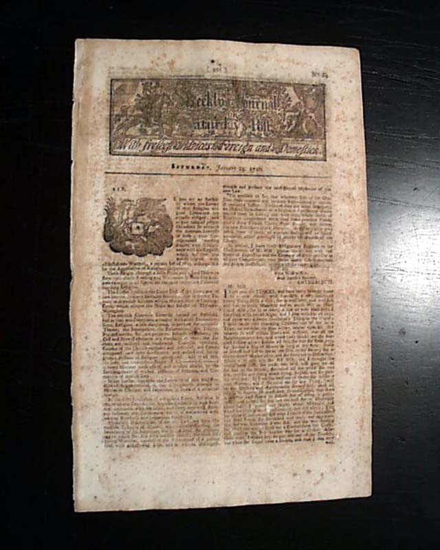 THE WEEKLY JOURNAL OR SATURDAY'S POST, London, Jan. 23, 1720  This title has one of the more beautiful & intricately engraved mastheads to be had, and is a nice display issue as such.