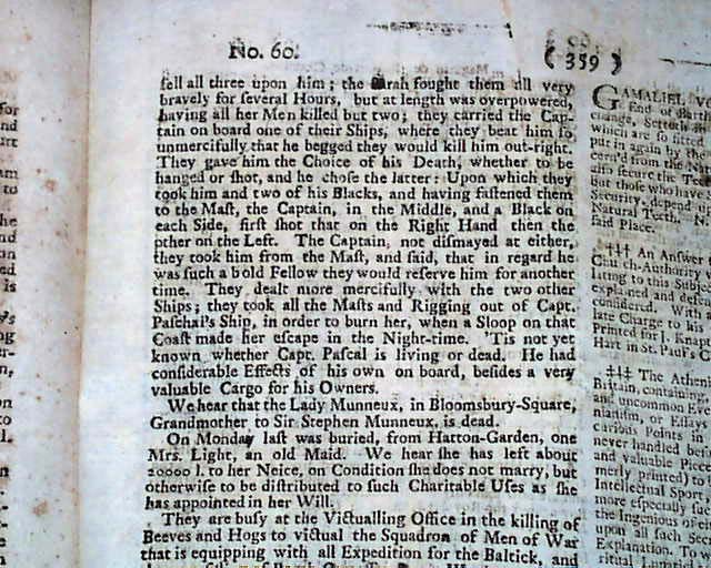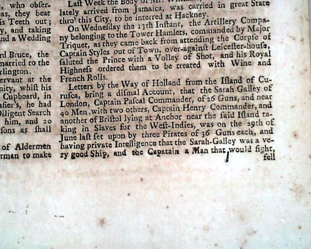 Pages 4 and 5 haver a nicer account: "...a dismal account, that the Sarah Galley of London...of 26 guns...lying at anchor near the said island taking in slaves for the West Indians, was on the 29th of June last set upon by three Pirates of 36 guns each...the captain, a man that would fight, fell all three upon him...fought them all very bravely for several hours but at length was overpowered...gave him the choice of his death; whether to be hanged or shot..." with further detail.