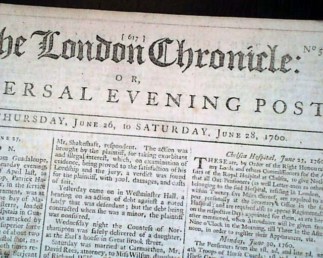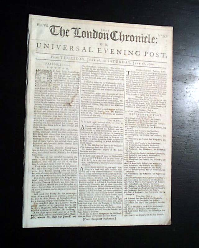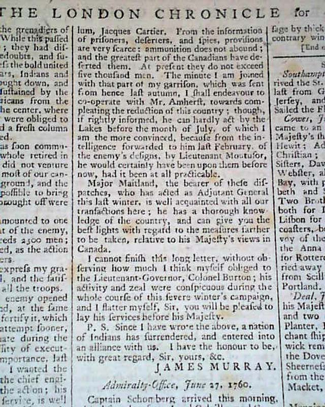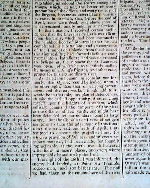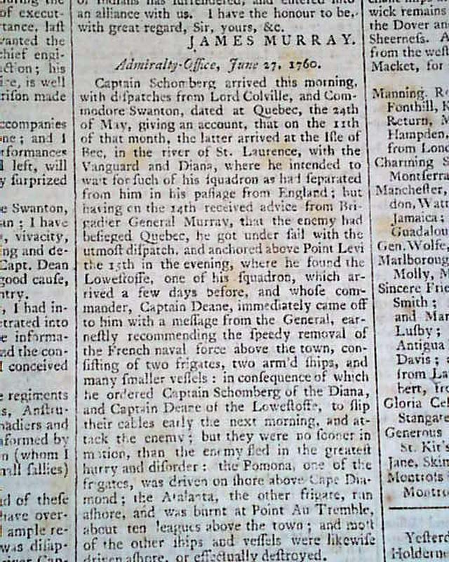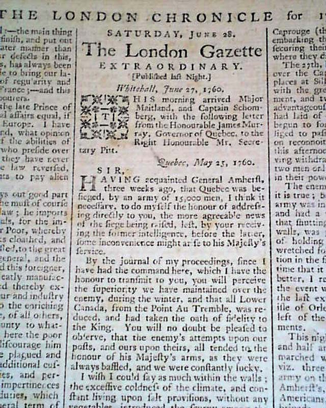 THE LONDON CHRONICLE, England, June 28, 1760 Pages 4 and 5 contains the report from 'The London Gazette Extraordinary' on the historic Siege of Quebec, or Second Battle of Quebec. This was a French attempt to retake Quebec City, Canada, which had been captured by Britain the previous year. The siege lasted for over 2 weeks in early May, when British ships arrived to relieve the city and compelled the French commander to break off the siege and to retreat.